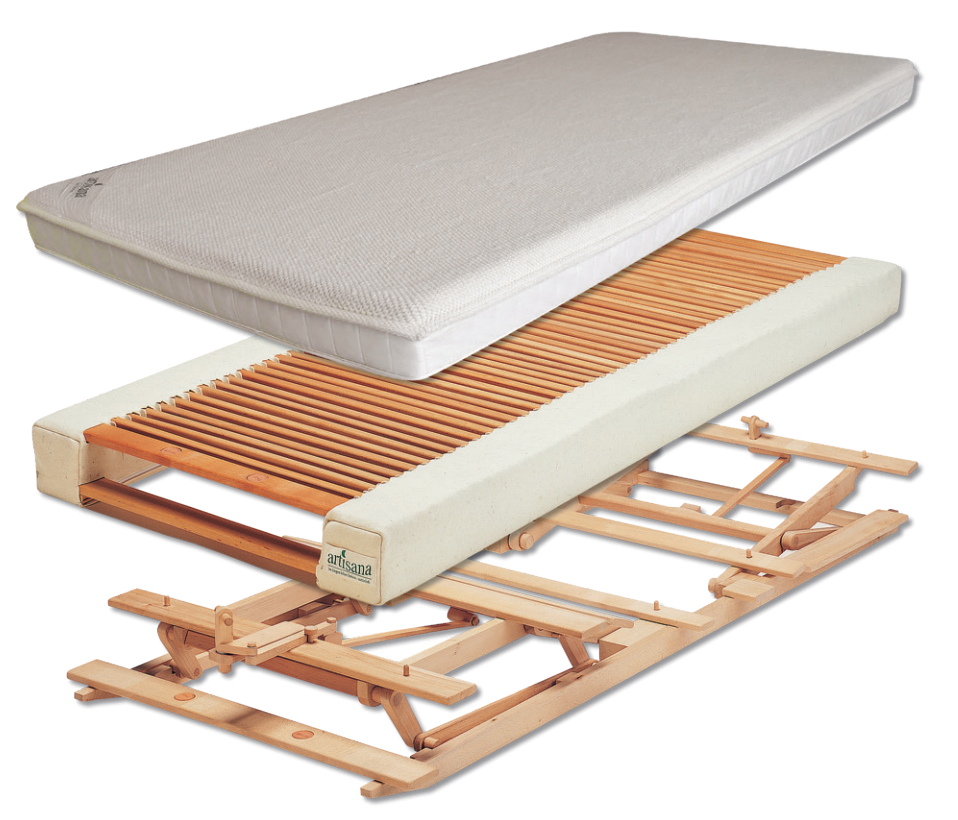 Federelement - gleichmäßige Körpergewichtsverteilung und unterschiedliche Festigkeitszonen nach Maß. Für einzigartige Wirbelsäulenentlastung und Bandscheibenregeneration. aus 48 geölten Massivholzbuchenleisten, die beidseitig in Naturlatexholmen (in QUL-Qualität) mit Profiloberkante beweglich gelagert und mit Schafschurwoll-Filz ummantelt sind. Bitte wählen Sie, ob sie in Verbindung mit dem Verstellrahmen eine Ausführung in starr / mit Kopfhochstellung / oder mit Kopf- Fußhochstellung wünschen ! für jedes Körpergewicht den richtigen Härtegrad ! Länge 200 cm x Breite 80 / 90 / 100 / 120 / 140 cm Artisana ist mit diesem Federlement das einzige Bettsystem mit Einstellung auf Körpergewicht und -kontur durch die integrierten Federkörper. Im Zusammenspiel mit der Polsterauflage bildet es das perfekt aufeinander und auf Ihre Anatomie abgestimmte Herzstück des Naturbett-Schlafsystems. Aufbau: Der elastische Federkörper besteht aus Buchenleisten, die auf beiden Seiten in Naturkautschuk-Holmen beweglich gelagert sind. Die Holme ermöglichen die ungehinderte Bewegung der Federkörper und somit ihre exakte Anpassung an den Körper. Funktion: Die Federkörper unterschiedlicher Festigkeit werden nach Ihren Maßen genau so zusammengestellt, dass Sie in allen Schlafpositionen richtig und bequem liegen. Dazu gehören v.a. Ihre Schulter-Becken-Proportion, Körpergröße und -gewicht. Das Federlement sorgt für eine gleichmäßige Verteilung des Körpergewichts und eine ganz auf Ihre Anatomie und Körperkontur abgestimmte Entlastung bzw. gezielte Stützung, z.B. in Schulter- (weicher) und Beckenzone (fester). Die Wirbelsäule wird dadurch entlastet und behält ihre natürliche S-Form. Die Bandscheiben können sich vollständig regenerieren. Mit wenigen Handgriffen können die einzelnen Federkörper ausgetauscht werden, so dass sich Ihr Bettsystem an besondere orthopädische Anforderungen oder spezielle akute Erfordernisse (z.B. der Wirbelsäule) anpassen kann. Durch Knick-Knick-Gelenke passt sich das Federlement der Kopf- und/oder Fußhochstellung des Verstellrahmens nahtlos an. Material: Die Federkörper sind aus massivem Buchenholz. Sie sind in Naturkautschuk-Holmen mit reiner Schafschurwoll-Ummantelung beweglich gelagert.