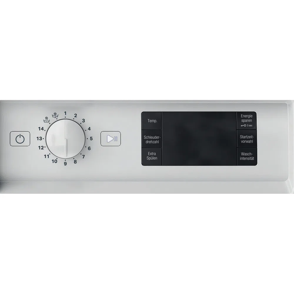 - Energieoptimierte Grundprogramme: Eco 40-60, Mischwäsche, Baumwolle, Buntwäsche, Pflegeleicht, Wolle, 20 °C, Spülen + Schleudern, Schleudern + Abpumpen, Feinwäsche