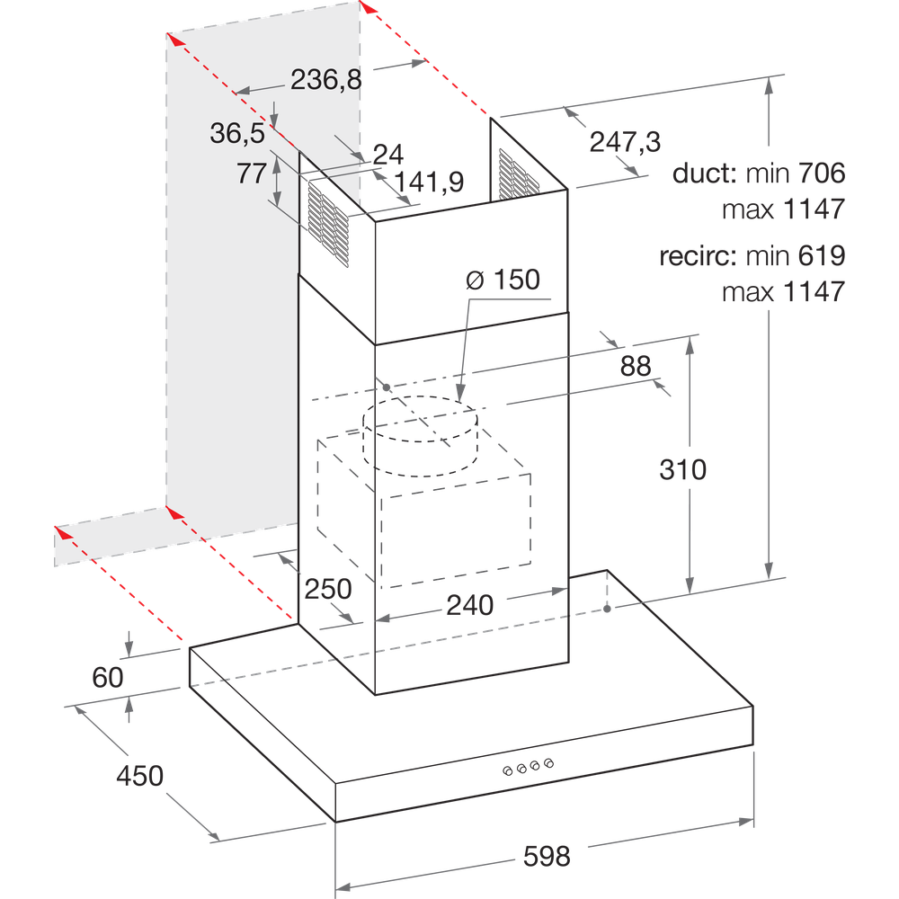 - Außenmaße (H x B x T): 1147 x 598 x 450 mm