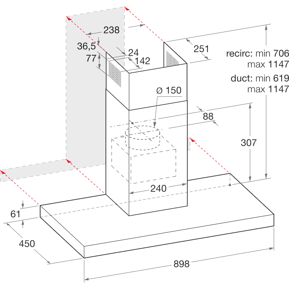 Gebläseleistung im Abluftbetrieb: max. Normalstufe 430 m³/h, Intensivstufe 730 m³/h Betriebsgeräusch im Abluftbetrieb: min. 31 max. 72 dB/A Außenmaße (HxBxT): 1147x898x450 mm Gesamte Gerätehöhe verstellbar von 619 bis 1147 mm Abluftstutzen Ø 150 mm Mindestabstand zum Elektrokochfeld 500 mm Mindestabstand zum Gaskochfeld 650 mm