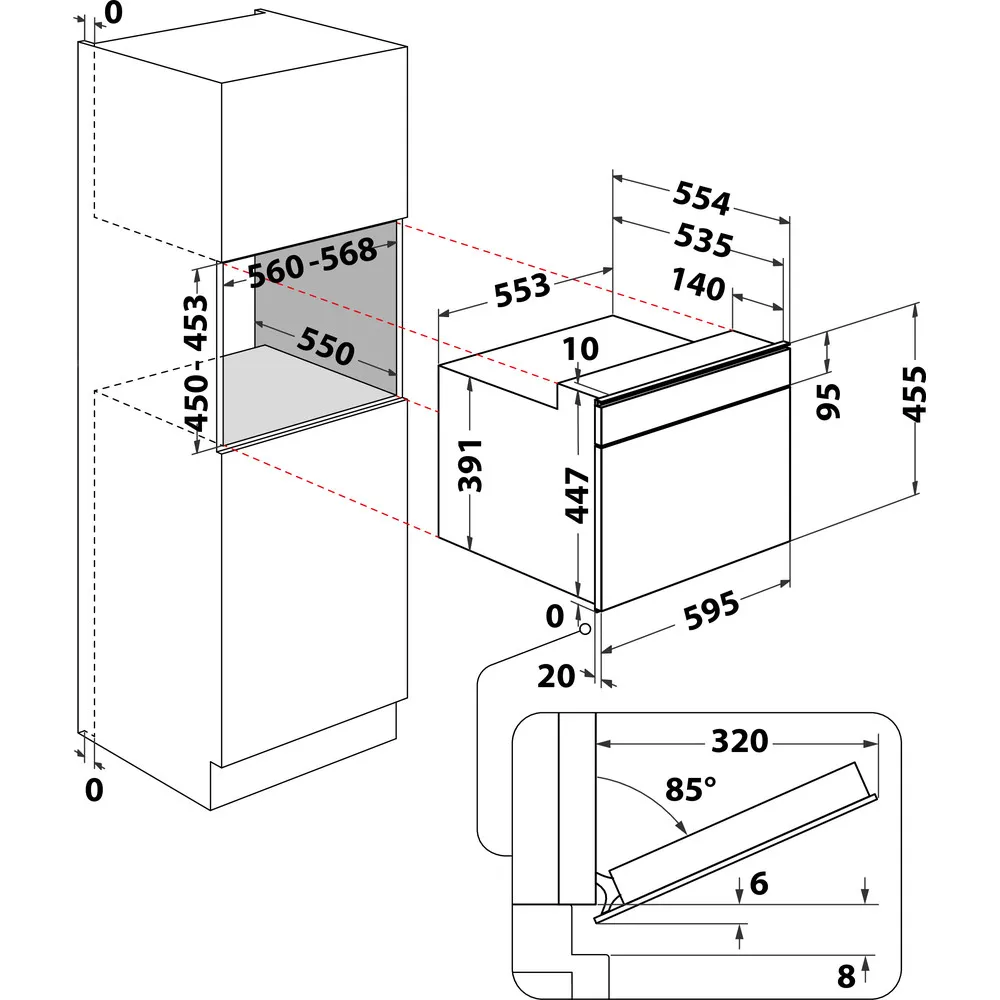 Länge des Anschlusskabels 135 cm Garraum-Innenabmessungen (HxBxT): 210x450x420 mm Nischenmaße (HxBxT): 450x556x550 mm Gerätemaße (HxBxT): 455x595x535 mm