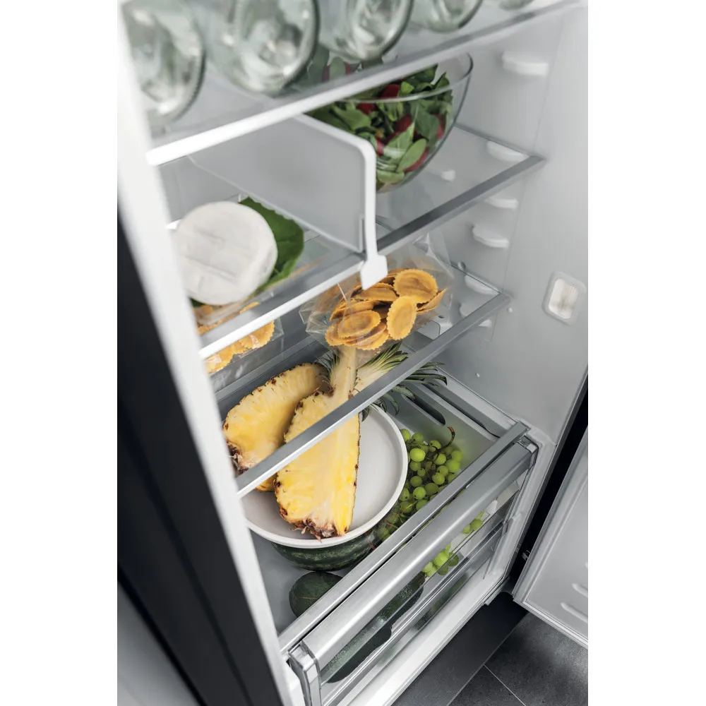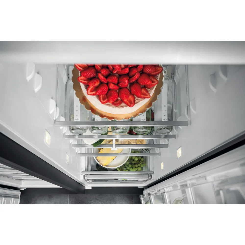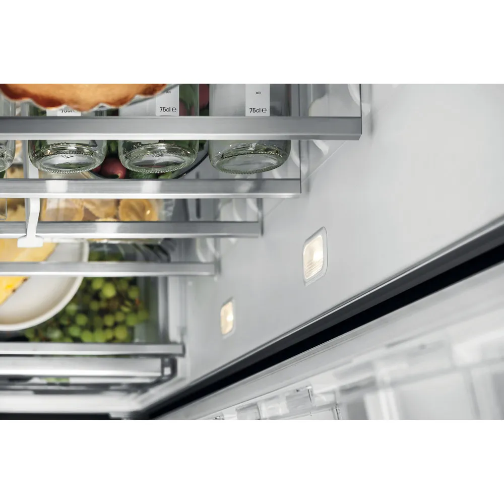 ProFresh sorgt dank permanenter Optimierung von Temperatur und Luftfeuchtigkeit für längere Frische Ihrer Lebensmittel Hygiene+ Filter schützt zuverlässig vor Bakterien, Keimen und Gerüchen Mehr Platz für große Gegenstände und maximale Flexibilität dank geteilter FlexiShelf-Glasablage Gleichmäßige Luftzirkulation im Kühlraum dank Ventilator Sicherer Halt dank hochwertiger Flaschenhalterung Optimale Ausleuchtung durch seitlich und oben angebrachte LED im Kühlraum Abtauautomatik im Kühlteil 6 Ablagen aus Sicherheitsglas, 1 teilbare Ablage, davon 5 höhenverstellbar 2 Obst- und Gemüseschubladen 5 Türfächer und Butterfach mit Klappe