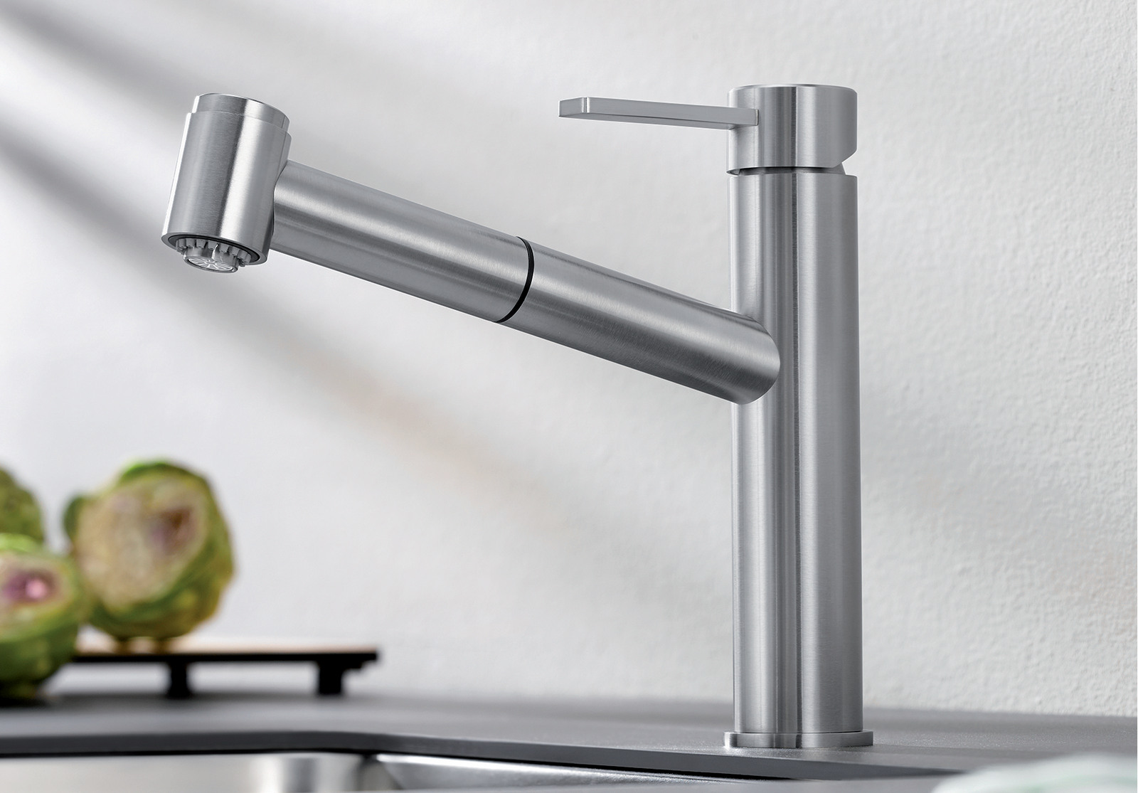 - Herausziehbare Schlauchbrause mit Umschaltfunktion von Perl- auf Brausestrahl per Druckknopf