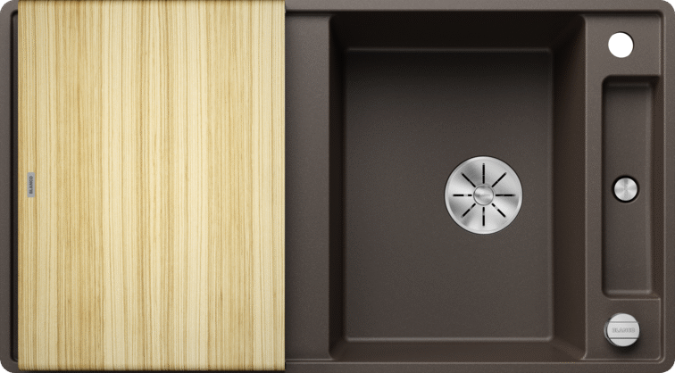 - Verschiebbares Schneidbrett zum Hineinarbeiten in Hauptbecken, Schale oder Abtropfmulde (wahlweise Esche-Compound oder Glas)