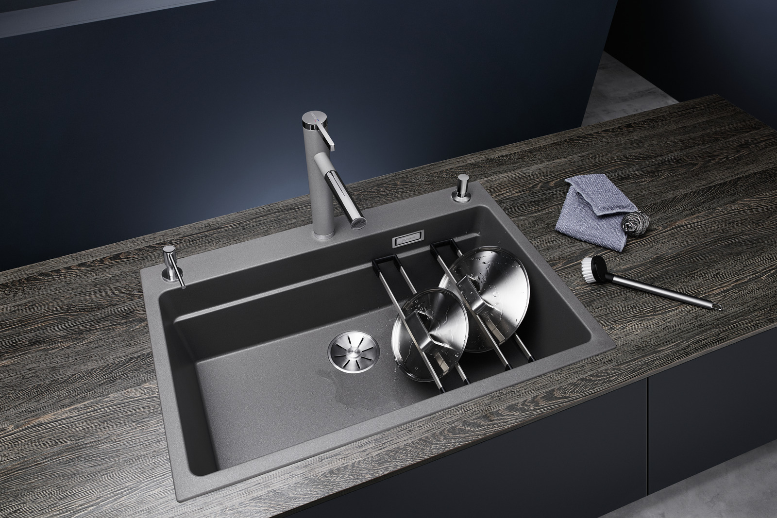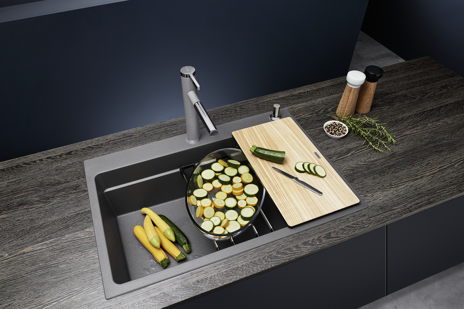 - Großzügiges Etagenbecken mit der Funktionalität eines Spülcenters