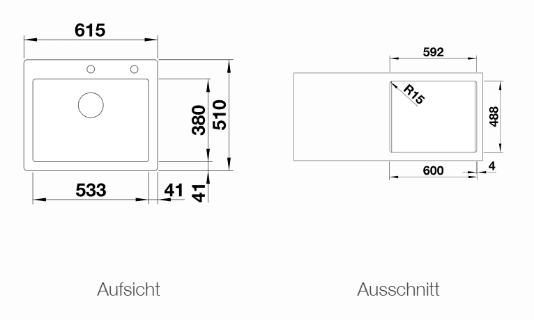 - Geräumiges, tiefes Einzelbecken mit durchgehender Batteriebank