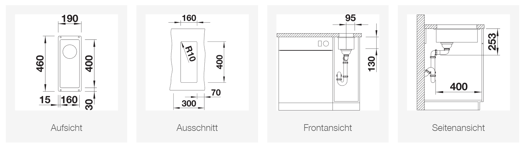 Bei Einzeleinbau nur als Unterbaubecken mit mind. 20 mm Arbeitsplatte. Zudem Entlüftungsventil (Art.-Nr. 225 616) notwendig.