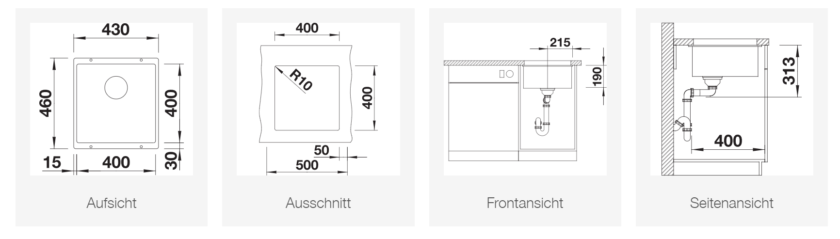 Planungshinweise: Beckentiefe 190 mm, Radius der Aussparung: 10 mm