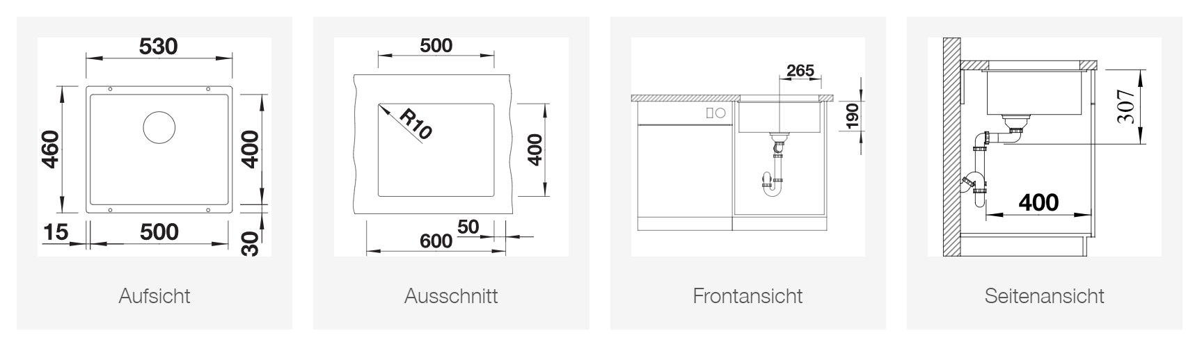 Planungshinweise: Beckentiefe 190 mm, Radius der Aussparung: 10 mm