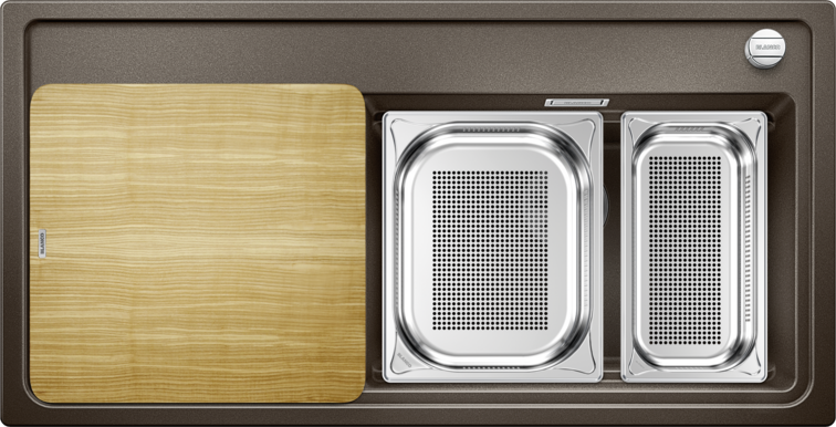 - Über die Spülenlänge verschiebbares Schneidbrett zum Hineinarbeiten in GN-Garbehälter