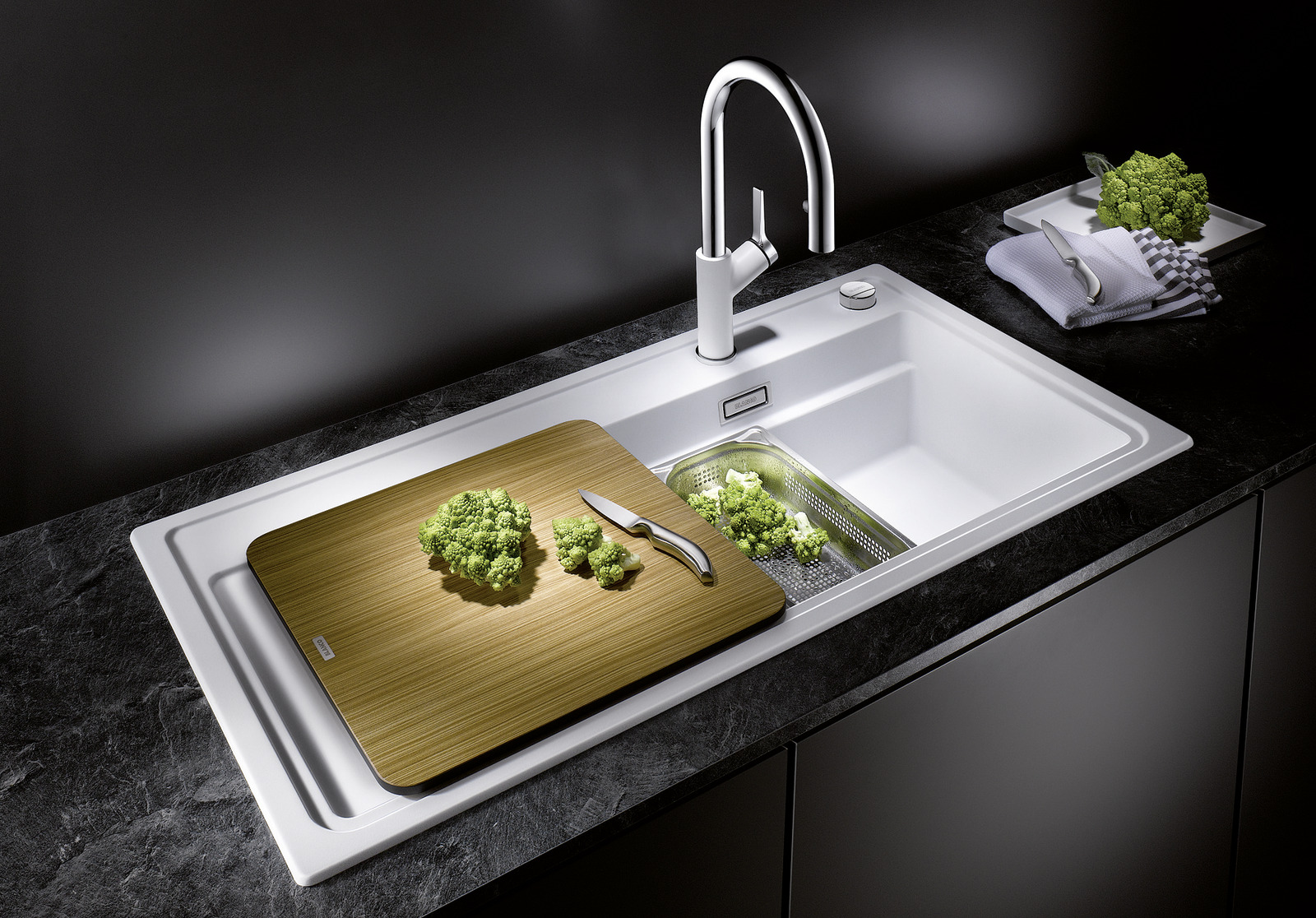 - Besonders großes Becken mit integrierter Stufe zur Aufnahme von GN-Garbehältern
