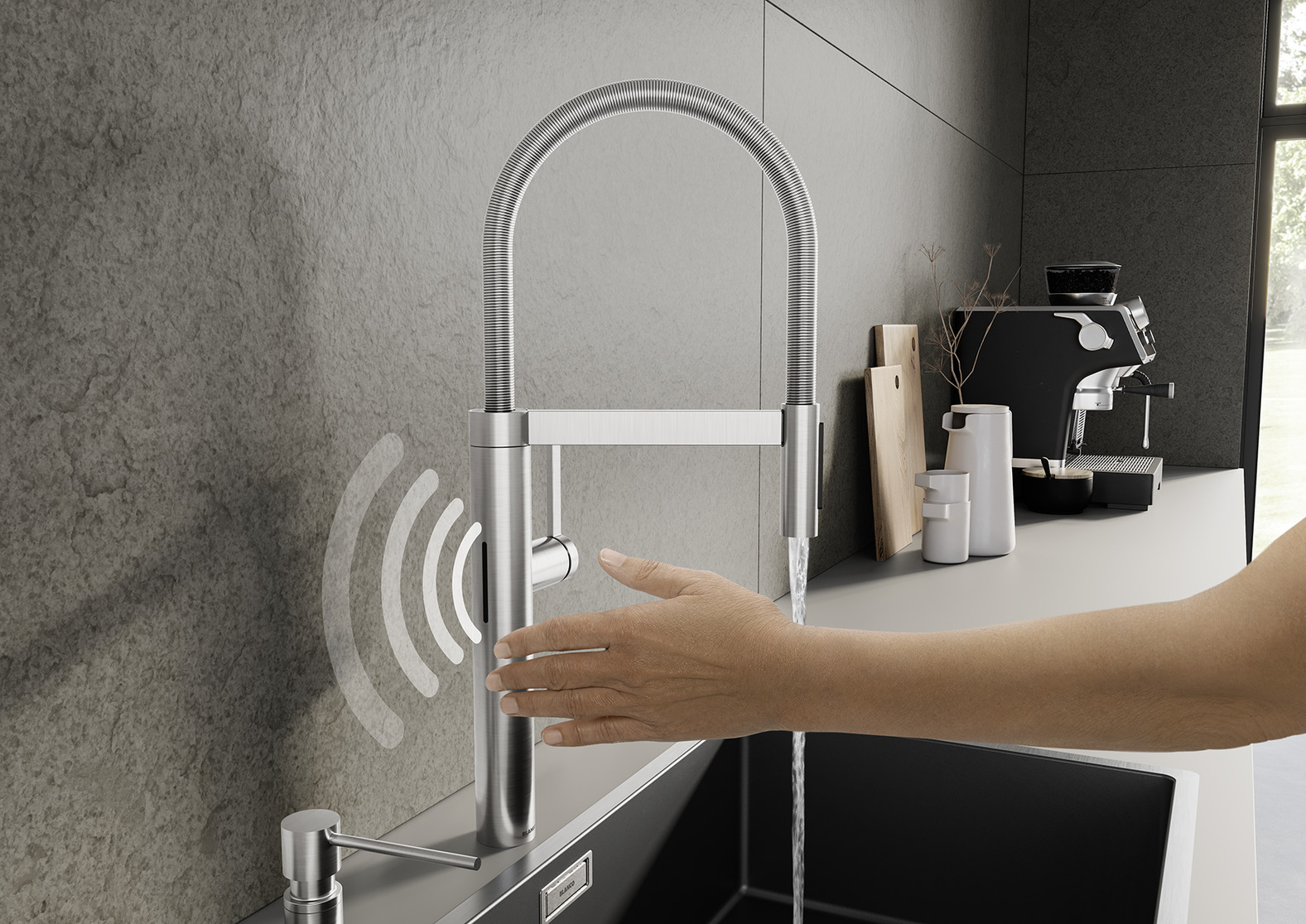 - Manuelle oder berührungslose Bedienung mit ausgeklügelter Doppelsensorik in Schlaucharm und Armaturenkörper für optimierte Arbeitsabläufe in der Küche