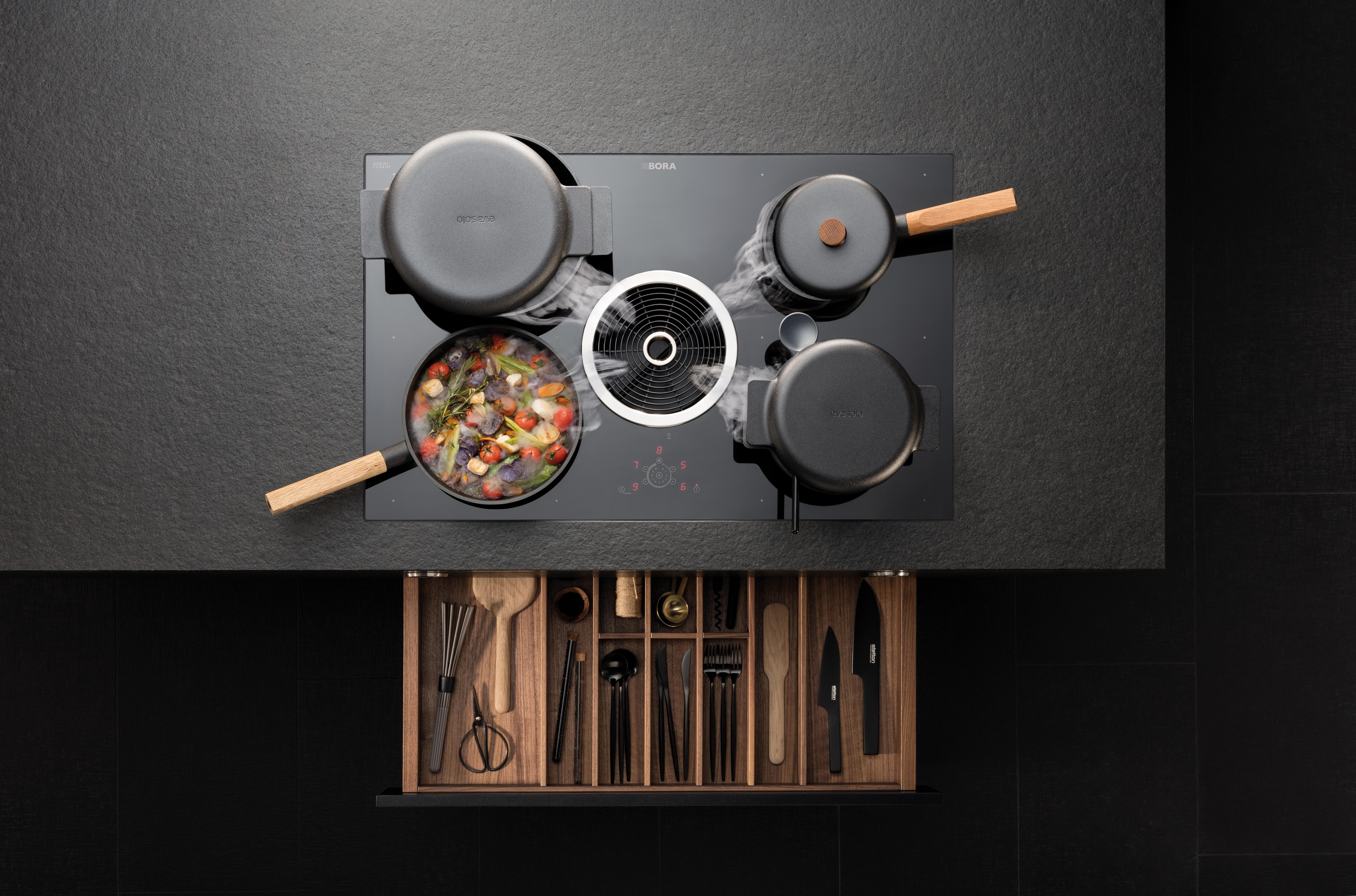 ? Anschlusskabel ist bauseits zur Verfügung zu stellen ? Netzanschlussdose vorne ? Das Basic Kochfeldabzugssystem ist mit allen BORA Steckdosen kombinierbar