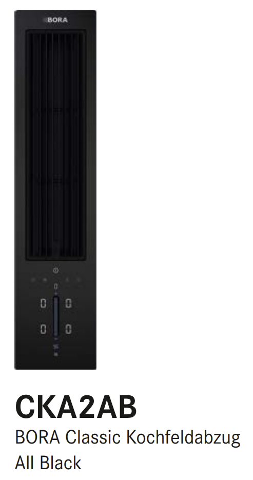 ? Der Kochfeldabzug CKA2AB ist die zentrale Komponente und enthält die komplette Bedienelektronik für das Gesamtsystem BORA Classic 2.0. Der Betrieb des Systems, oder der von Einzelkomponenten, ist ohne Kochfeldabzug nicht möglich. ? Das System BORA Classic 2.0 wird über das Bedienfeld des Kochfeldabzugs CKA2AB bedient. ? Kombinierbar mit allen BORA Classic 2.0 Kochfeldern ? Die Arbeitsplattenhöhe und -tiefe kann flexibel angepasst werden ? Montageart: flächenbündig oder Aufsatz ? Abluftführung nach rechts und nach links möglich ? Lüfter kann durch geringe Aufbauhöhe (100 mm) im Sockelbereich platziert werden (nur bei Verwendung des Sockellüfters ULS) ? Die Classic 2.0 Steuerungseinheit als zentrale Anschlussstelle kann einfach und platzsparend im Sockelbereich platziert werden ? Verbindung zwischen Touch-Bedienung und Classic 2.0 Steuerungseinheit mittels Kommunikationsleitung CAT 5 ? Die Schubläden bzw. Fachböden im Unterschrank müssen für Wartungs- und Reinigungszwecke herausnehmbar sein ? Das Kanalsystem BORA Ecotube ist optimal auf die BORA Kochfeldabzüge abgestimmt und gewährleistet 100%ige Funktion und beste Leistung ? Einsatz eines zusätzlichen Lüfterbausteins für sehr lange bzw. komplexe Abluftstrecken möglich ? Das Classic 2.0 Kochfeldabzugssystem ist mit allen BORA Steckdosen kombinierbar