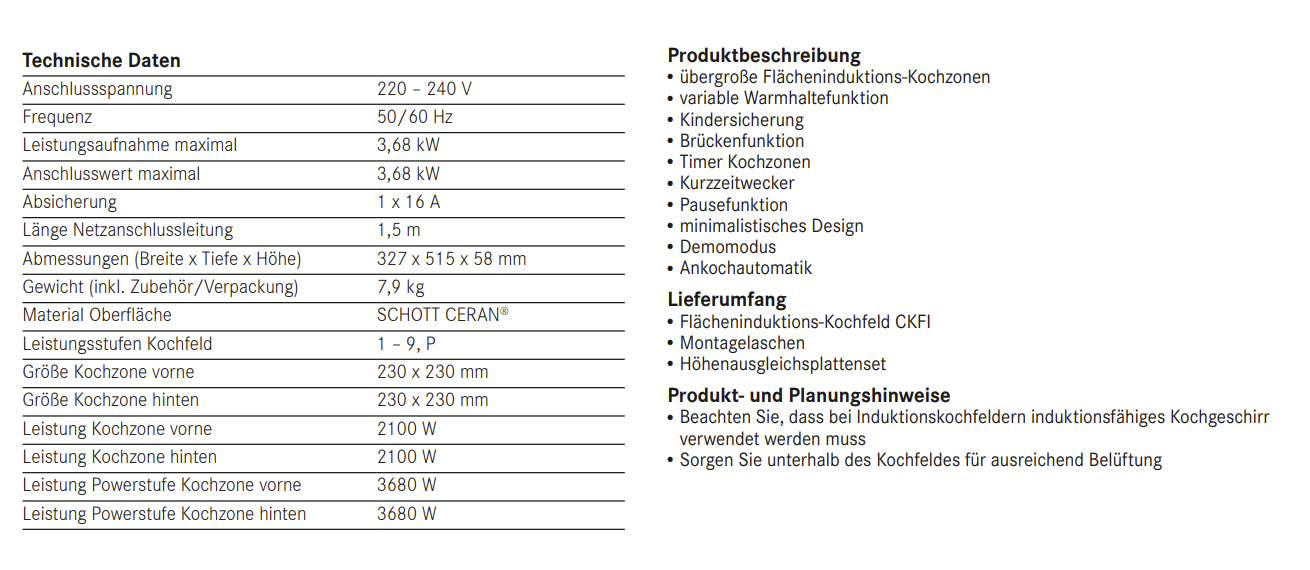 ? übergroße Flächeninduktions-Kochzonen ? variable Warmhaltefunktion ? Kindersicherung ? Brückenfunktion ? Timer Kochzonen ? Kurzzeitwecker ? Pausefunktion ? minimalistisches Design ? Demomodus ? Ankochautomatik