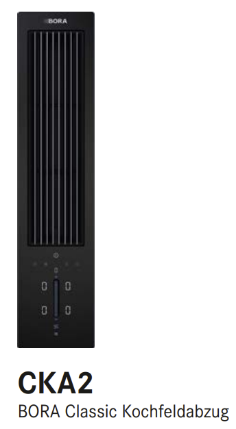 ? Der Kochfeldabzug CKA2 ist die zentrale Komponente und enthält die komplette Bedienelektronik für das Gesamtsystem BORA Classic 2.0. Der Betrieb des Systems, oder der von Einzelkomponenten, ist ohne Kochfeldabzug nicht möglich. ? Das System BORA Classic 2.0 wird über das Bedienfeld des Kochfeldabzugs CKA2 bedient. ? Kombinierbar mit allen BORA Classic 2.0 Kochfeldern ? Die Arbeitsplattenhöhe und -tiefe kann flexibel angepasst werden ? Montageart: flächenbündig oder Aufsatz ? Abluftführung nach rechts und nach links möglich ? Lüfter kann durch geringe Aufbauhöhe (100 mm) im Sockelbereich platziert werden (nur bei Verwendung des Sockellüfters ULS) ? Die Classic 2.0 Steuerungseinheit als zentrale Anschlussstelle kann einfach und platzsparend im Sockelbereich platziert werden ? Verbindung zwischen Touch-Bedienung und Classic 2.0 Steuerungseinheit mittels Kommunikationsleitung CAT 5 ? Die Schubläden bzw. Fachböden im Unterschrank müssen für Wartungs- und Reinigungszwecke herausnehmbar sein ? Das Kanalsystem BORA Ecotube ist optimal auf die BORA Kochfeldabzüge abgestimmt und gewährleistet 100%ige Funktion und beste Leistung ? Einsatz eines zusätzlichen Lüfterbausteins für sehr lange bzw. komplexe Abluftstrecken möglich ? Das Classic 2.0 Kochfeldabzugssystem ist mit allen BORA Steckdosen kombinierbar