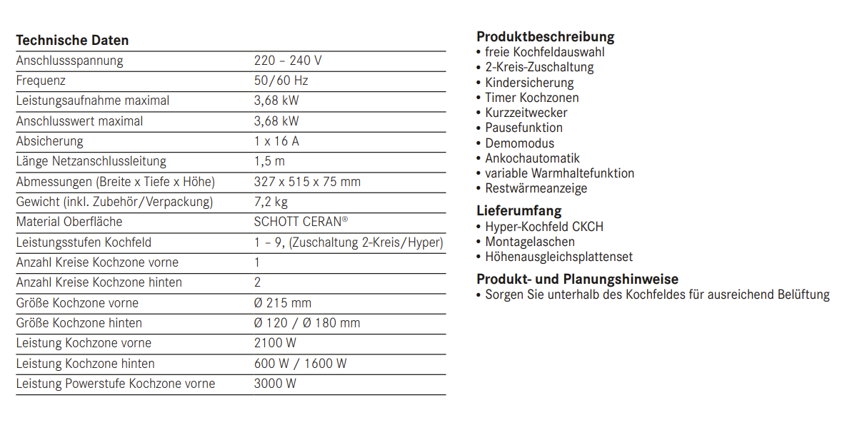 ? freie Kochfeldauswahl ? 2-Kreis-Zuschaltung ? Kindersicherung ? Timer Kochzonen ? Kurzzeitwecker ? Pausefunktion ? Demomodus ? Ankochautomatik ? variable Warmhaltefunktion ? Restwärmeanzeige