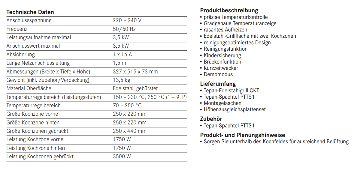 ? Tepan-Edelstahlgrill CKT ? Tepan-Spachtel PTTS1 ? Montagelaschen ? Höhenausgleichsplattenset
