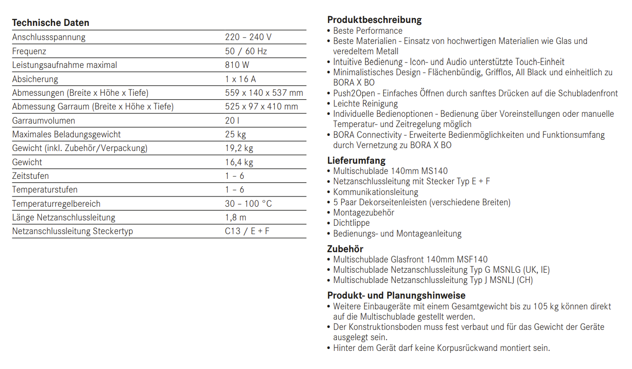 ? Beste Performance ? Beste Materialien - Einsatz von hochwertigen Materialien wie Glas und veredeltem Metall ? Intuitive Bedienung - Icon- und Audio unterstützte Touch-Einheit ? Minimalistisches Design - Flächenbündig, Grifflos, All Black und einheitlich zu BORA X BO ? Push2Open - Einfaches Öffnen durch sanftes Drücken auf die Schubladenfront ? Leichte Reinigung ? Individuelle Bedienoptionen - Bedienung über Voreinstellungen oder manuelle Temperatur- und Zeitregelung möglich ? BORA Connectivity - Erweiterte Bedienmöglichkeiten und Funktionsumfang durch Vernetzung zu BORA X BO