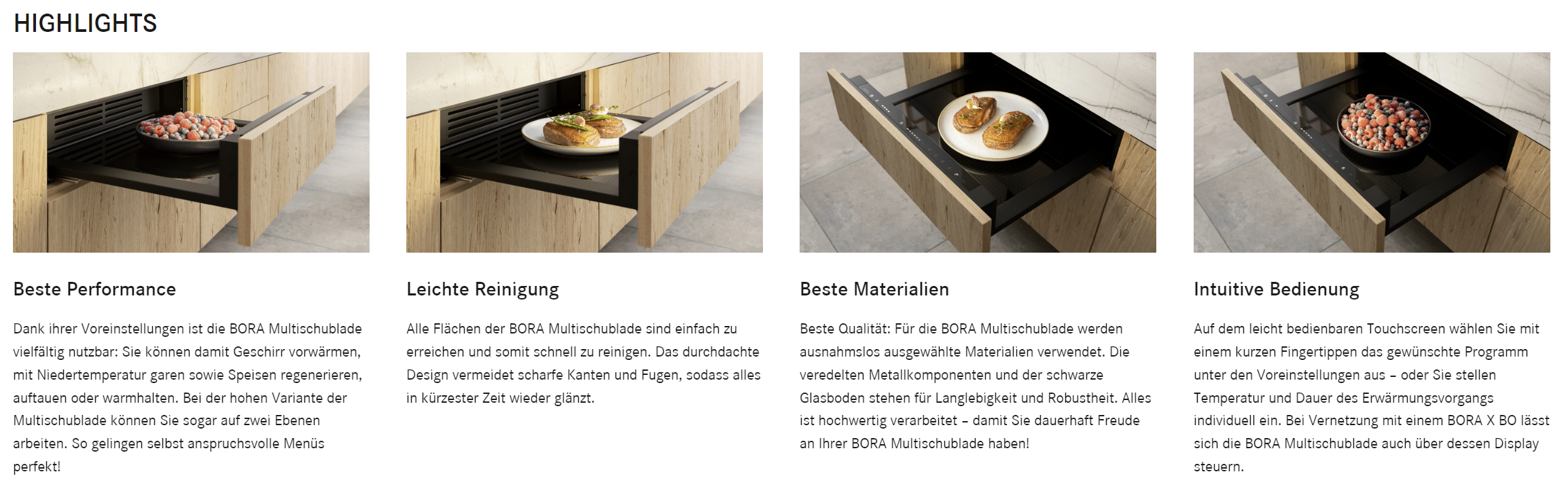 ? Komfort - Stauraum & Traglast großzügig ausgelegt ? Beste Materialien - Einsatz von hochwertigen Materialien wie Glas und veredeltem Metall ? Intuitive Bedienung - Icon- und Audio unterstützte Touch-Einheit ? Beste Performance ? Push2Open - Einfaches Öffnen durch sanftes Drücken auf die Schubladenfront ? Minimalistisches Design - Flächenbündig, Grifflos, All Black, personalisierbar und einheitlich zu BORA X BO ? Leichte Reinigung ? Individuelle Bedienoptionen - Bedienung über Voreinstellungen oder manuelle Temperatur- und Zeitregelung möglich ? BORA Connectivity - Erweiterte Bedienmöglichkeiten und Funktionsumfang durch Vernetzung zu BORA X BO ? Spülmaschinenfester Ebenen-Rost