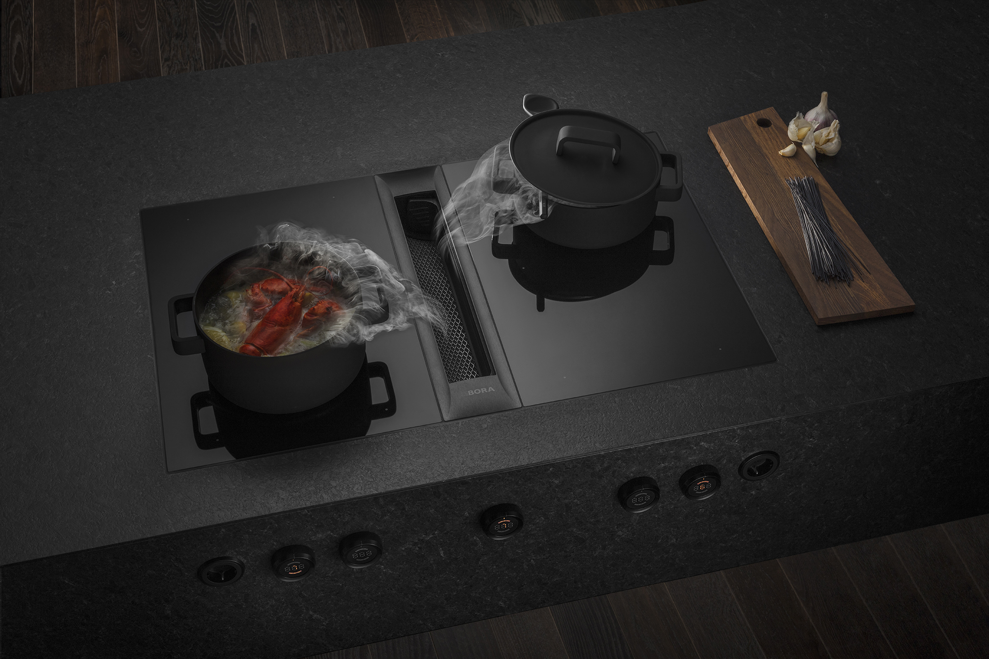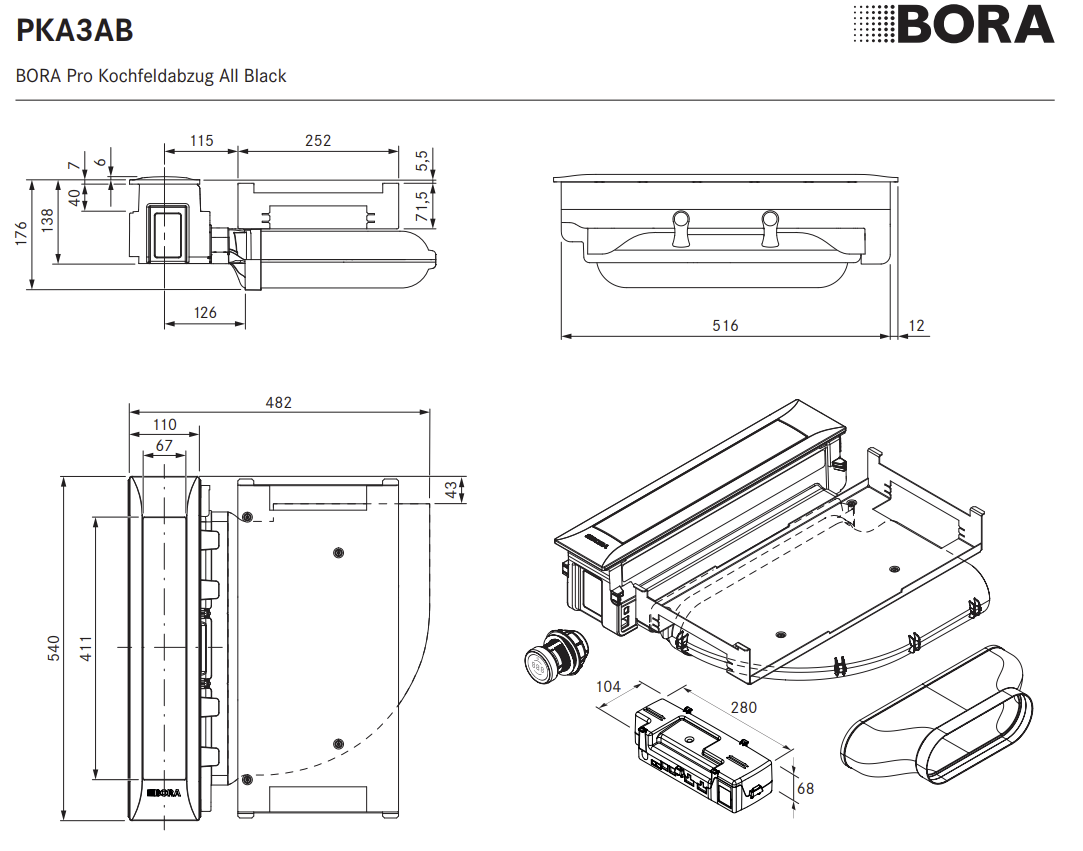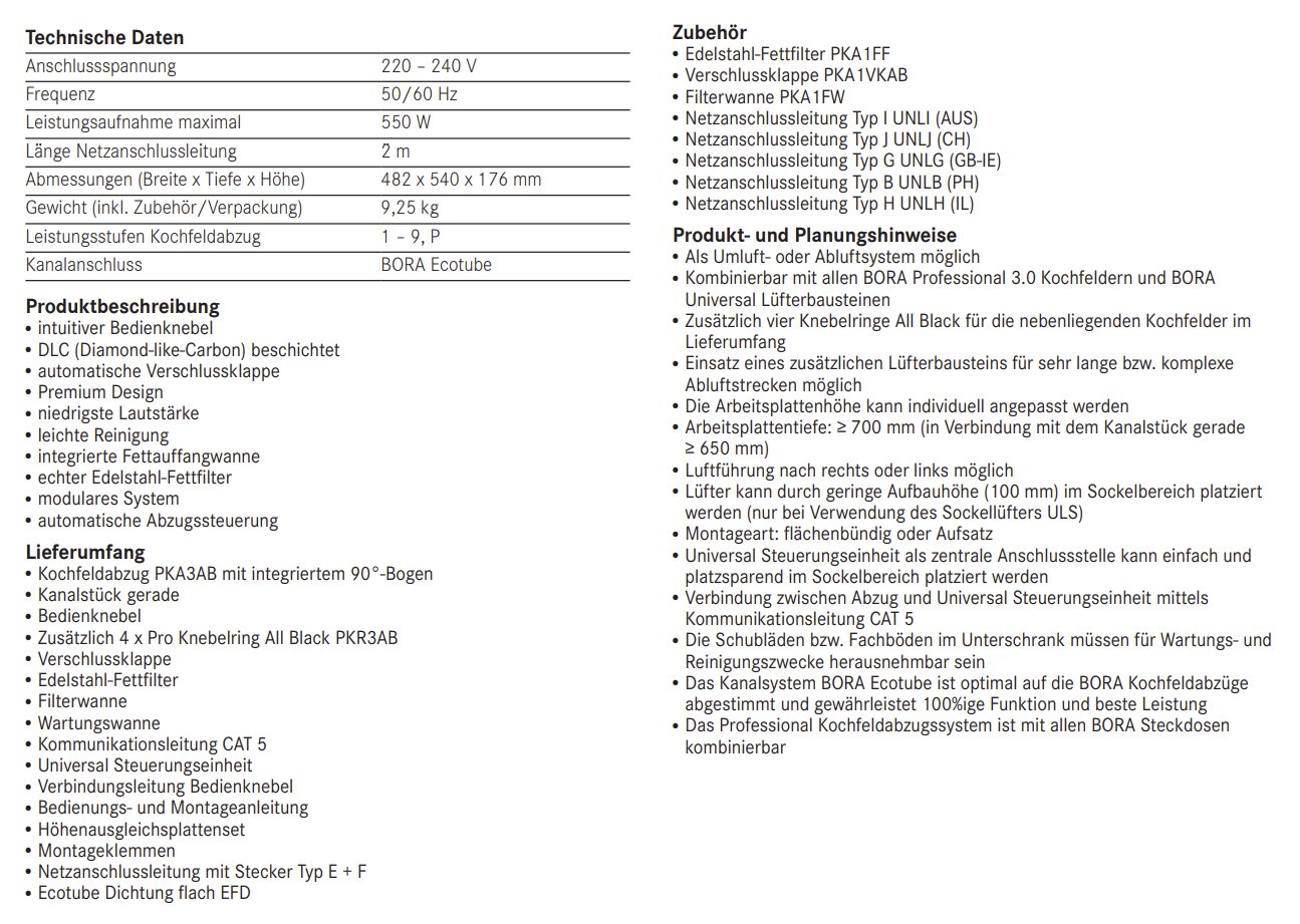 ? Als Umluft- oder Abluftsystem möglich ? Kombinierbar mit allen BORA Professional 3.0 Kochfeldern und BORA Universal Lüfterbausteinen ? Zusätzlich vier Knebelringe All Black für die nebenliegenden Kochfelder im Lieferumfang ? Einsatz eines zusätzlichen Lüfterbausteins für sehr lange bzw. komplexe Abluftstrecken möglich ? Die Arbeitsplattenhöhe kann individuell angepasst werden ? Arbeitsplattentiefe: ? 700 mm (in Verbindung mit dem Kanalstück gerade ? 650 mm) ? Luftführung nach rechts oder links möglich ? Lüfter kann durch geringe Aufbauhöhe (100 mm) im Sockelbereich platziert werden (nur bei Verwendung des Sockellüfters ULS) ? Montageart: flächenbündig oder Aufsatz ? Universal Steuerungseinheit als zentrale Anschlussstelle kann einfach und platzsparend im Sockelbereich platziert werden ? Verbindung zwischen Abzug und Universal Steuerungseinheit mittels Kommunikationsleitung CAT 5 ? Die Schubläden bzw. Fachböden im Unterschrank müssen für Wartungs- und Reinigungszwecke herausnehmbar sein ? Das Kanalsystem BORA Ecotube ist optimal auf die BORA Kochfeldabzüge abgestimmt und gewährleistet 100%ige Funktion und beste Leistung ? Das Professional Kochfeldabzugssystem ist mit allen BORA Steckdosen kombinierbar