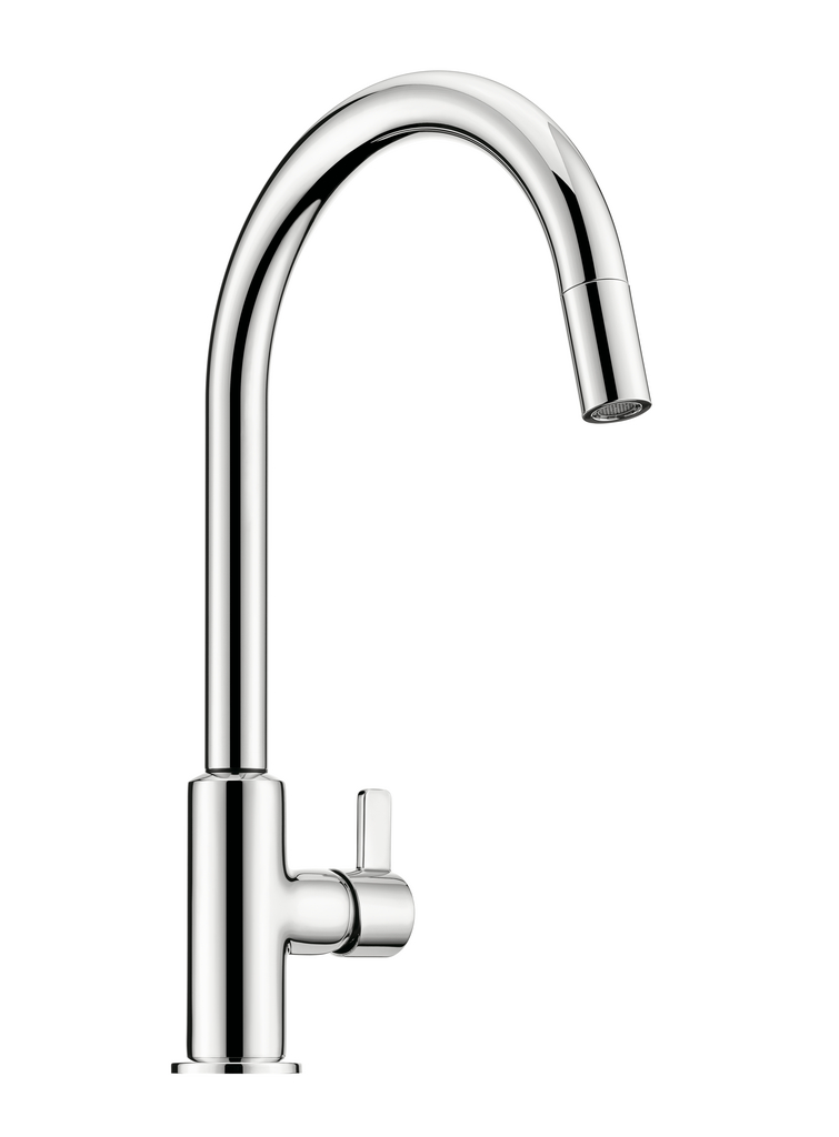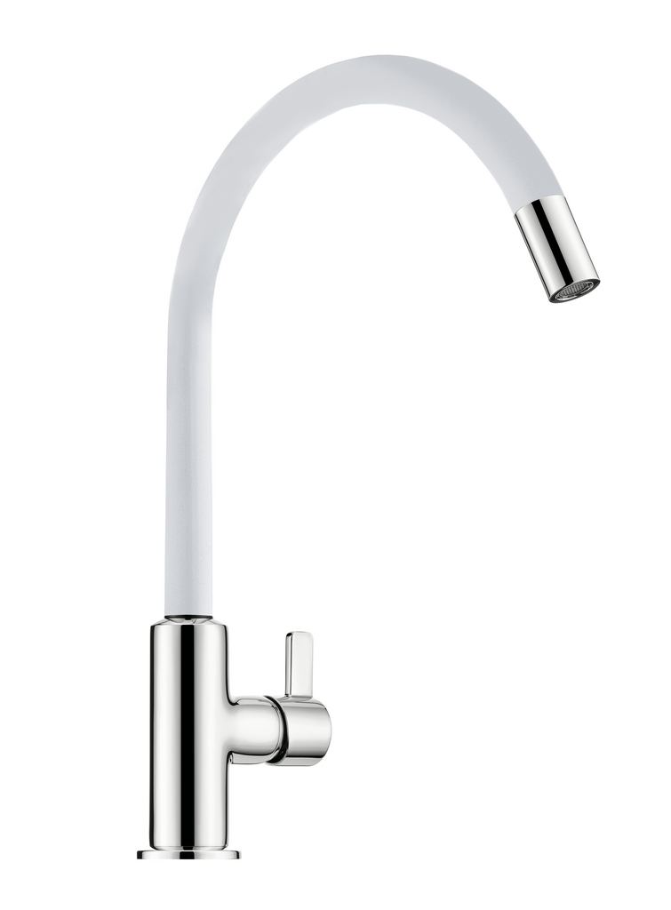 Attraktives Design mit einem ansprechenden hohen und schwenkbaren Auslauf gepaart mit neuen Auslauffarben (schwarz matt/chrom und weiß matt/chrom). Durch den kürzeren Hebel ist eine Montage vor Rückwänden möglich.