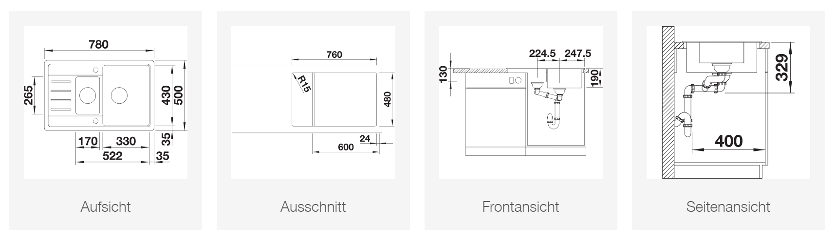 Fragranit+, in diversen Farben lieferbarMit Sanitized® behandeltes Material für eine besonders hygienische Oberfläche Unterbau ab 60 cm reversible Einbaumöglichkeit Klare Formgebung mit tiefer liegendem Abtropfbereich Große Becken mit engem 10 mm Eckradius Drehknopf rund Edelstahl oder NEU: Druckknopfausführung mit verdecktem Überlauf Siebkorb als Excenterventil 3 1/2" Spülenmaß: 780x500 mm Becken: 350x425x190 und 160x300x120 mm Nutzbares Volumen: 16,5 und 4,5 l Planungshinweise: Ausschnitt: 760x480 mm R11 Lieferumfang: inklusive Ablaufgarnitur Reversible Einbaumöglichkeit