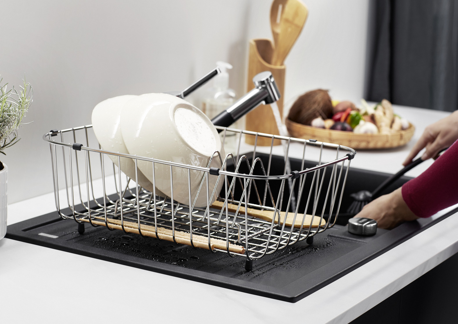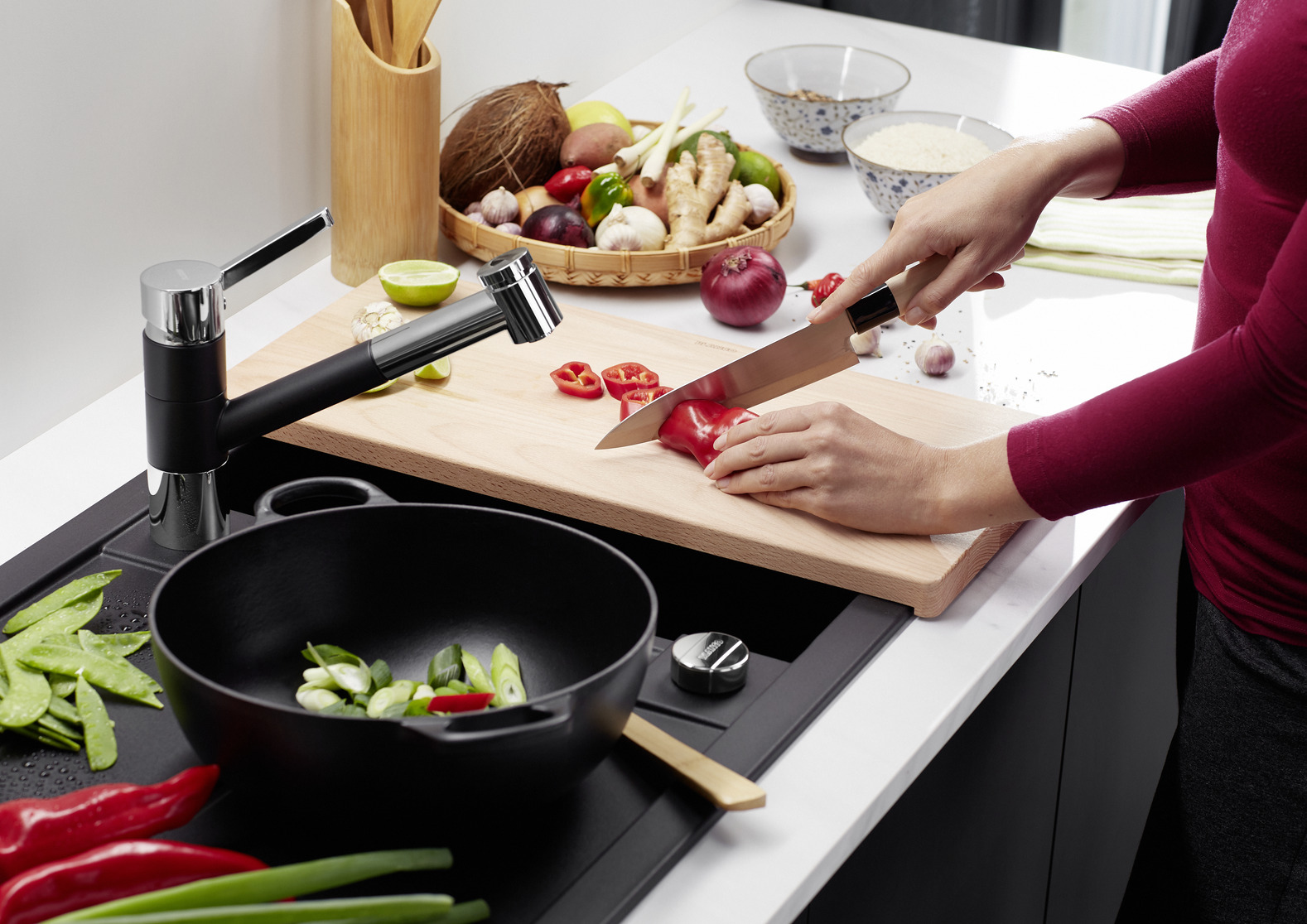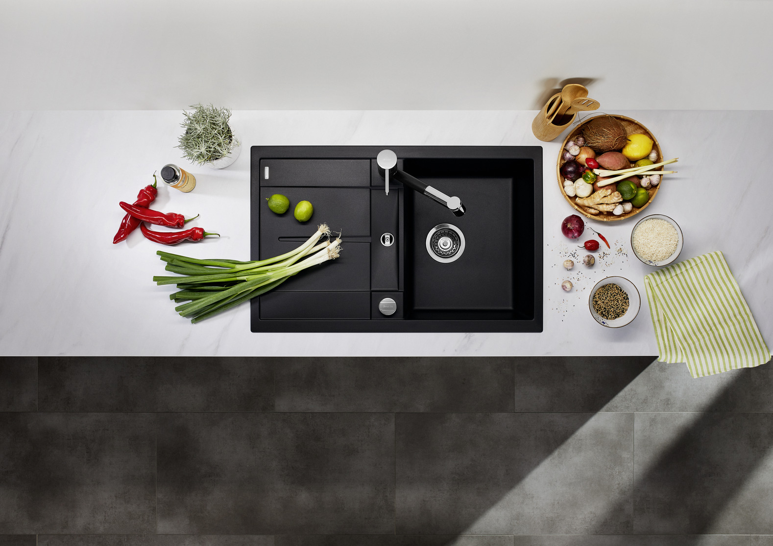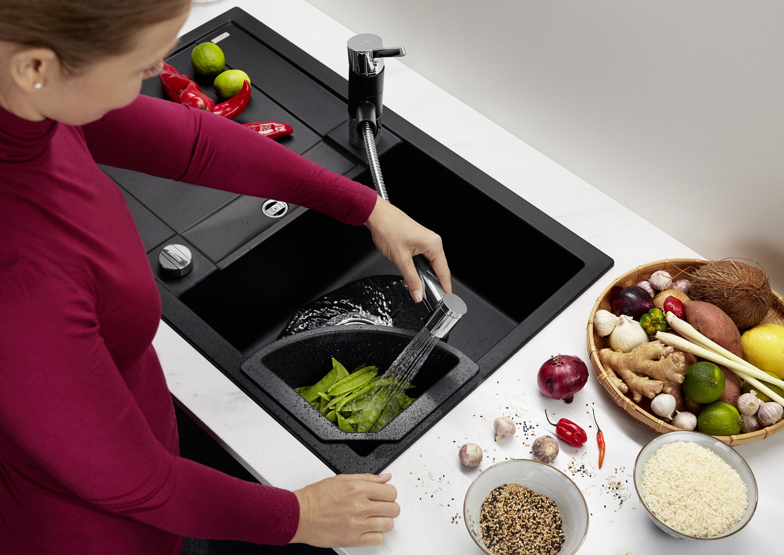 Funktionale Abtropffläche, auch als Arbeitsfläche nutzbar, mit integriertem Ausguss