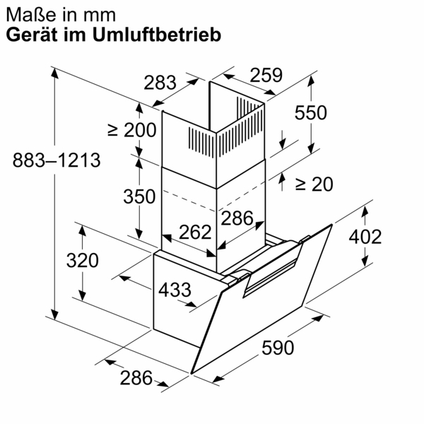 - Gerätemaße Abluft (HxBxT): 883-1126 x 590 x 433 mm