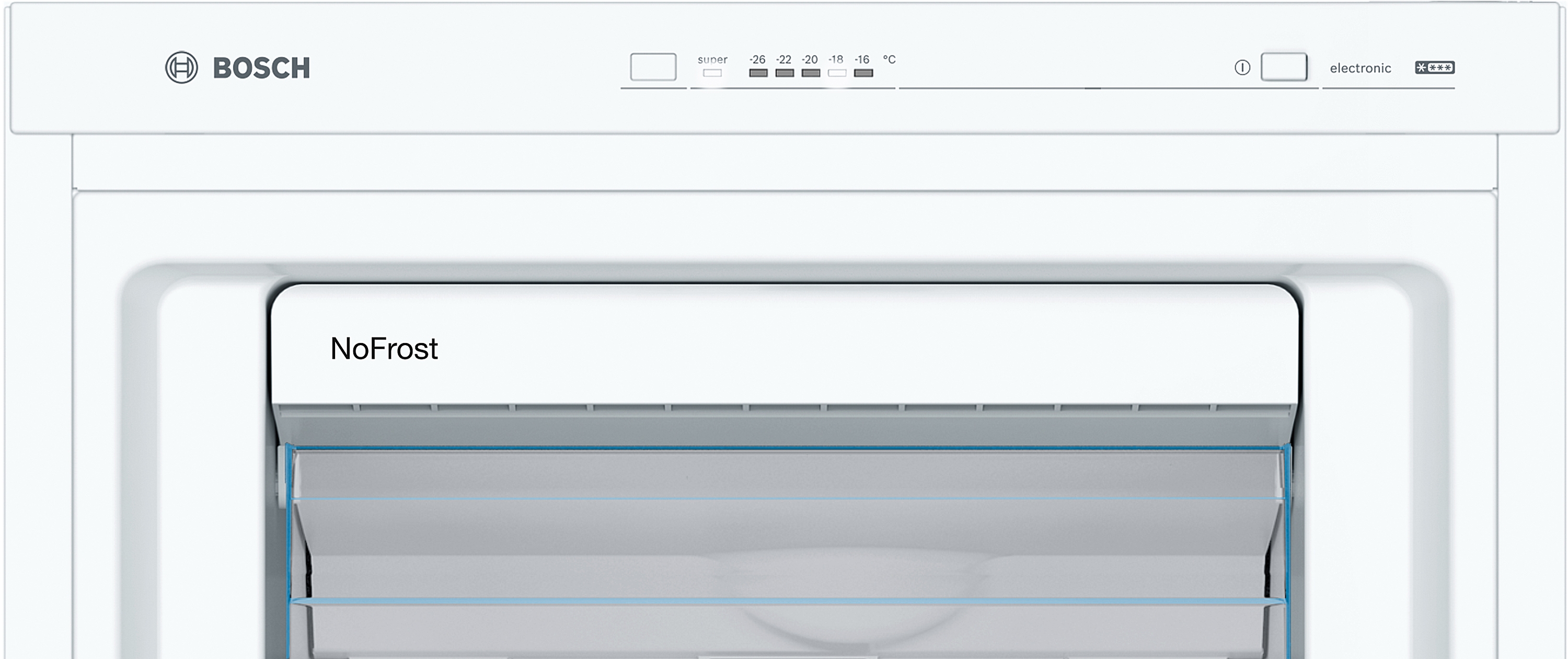 | Bedienelemente: | Superschalter Gefrieren, Temperaturanzeige für Gefrieren, Warnfunktionen Gefrierteil, Warnsignal Störung Gefrieren, Warnsignal Tür offen |
