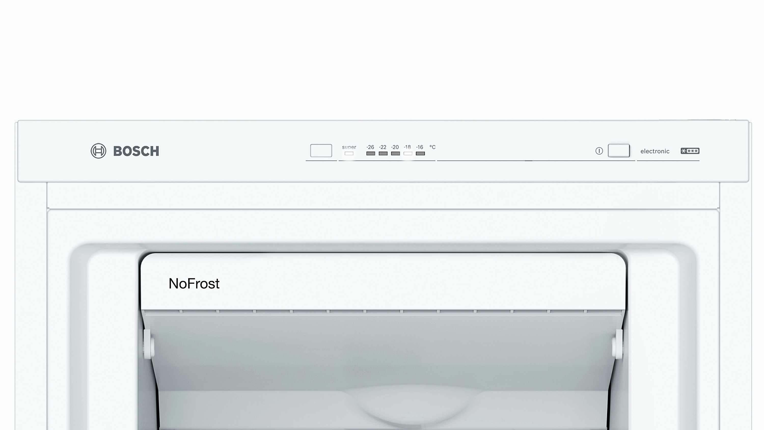 | Bedienelemente: | Superschalter Gefrieren, Temperaturanzeige für Gefrieren, Warnfunktionen Gefrierteil, Warnsignal Störung Gefrieren, Warnsignal Tür offen |