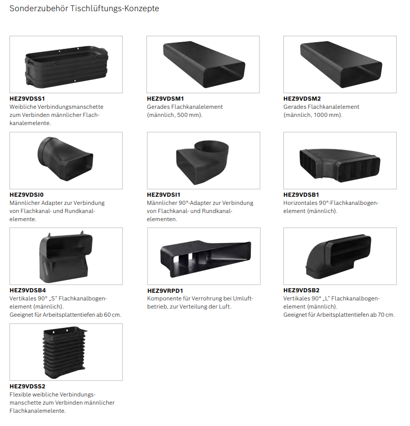Das "Plug 'n Play" Starter Set HEZ9VRUD0 (ungeführten Umluftbetrieb) ermöglicht einfache und schnelle Installationen in Arbeitsplattentiefen 60cm. Für Installationen mit Abluftkonfiguration (HEZ9VEDU0) und in voll- oder teilgeführter Umluftkonfiguration (HEZ9VRPD0) - ist eine Arbeitsplattentiefe von 70cm erforderlich