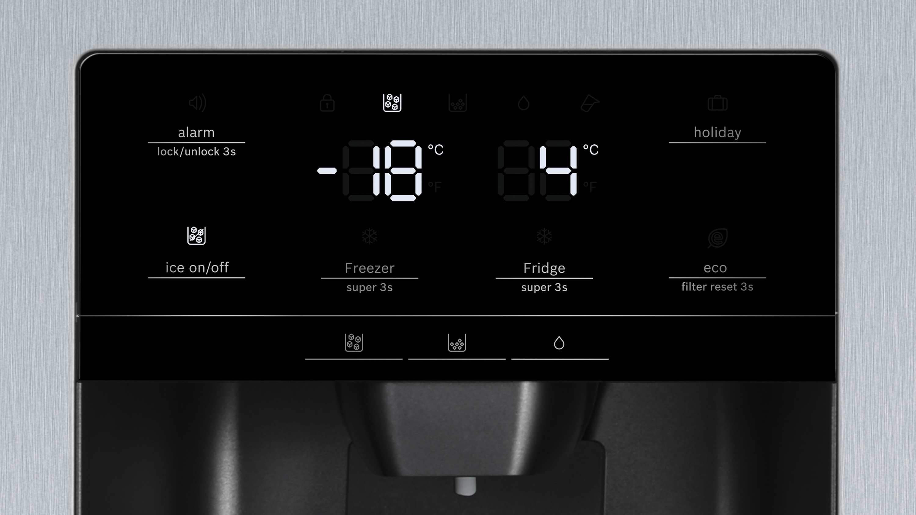Die NoFrost side-by-side Kühl-Gefrier-Kombination mit Indoor Elektronik: bietet Ihnen ein modernes Tür-Display u. erspart das Abtauen.