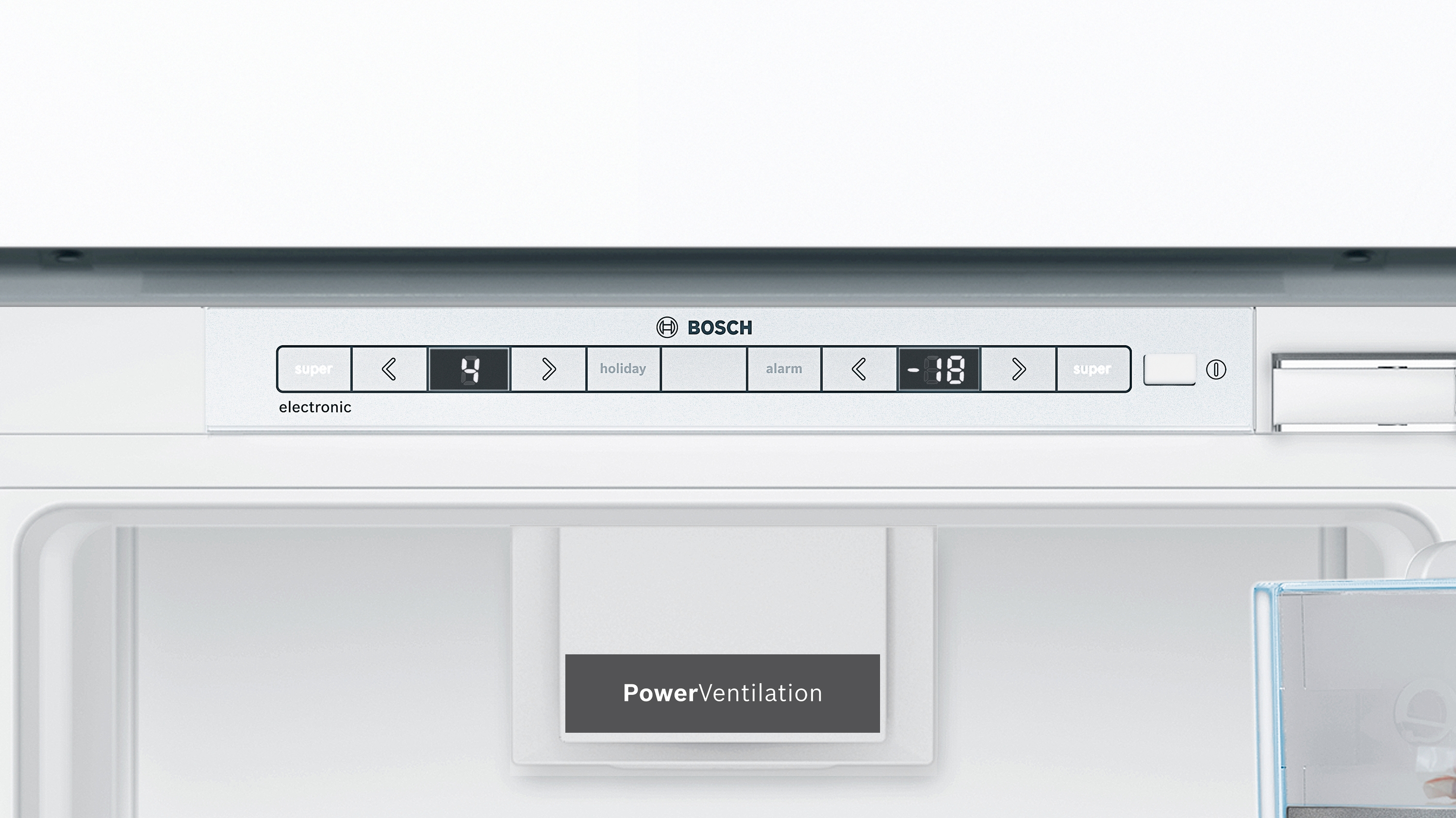 | Bedienelemente: | Superschalter Gefrieren, Superschalter Kühlen, Temperaturanzeige für Kühlen, Warnfunktionen Gefrierteil, Warnsignal Störung Gefrieren, Warnsignal Tür offen |