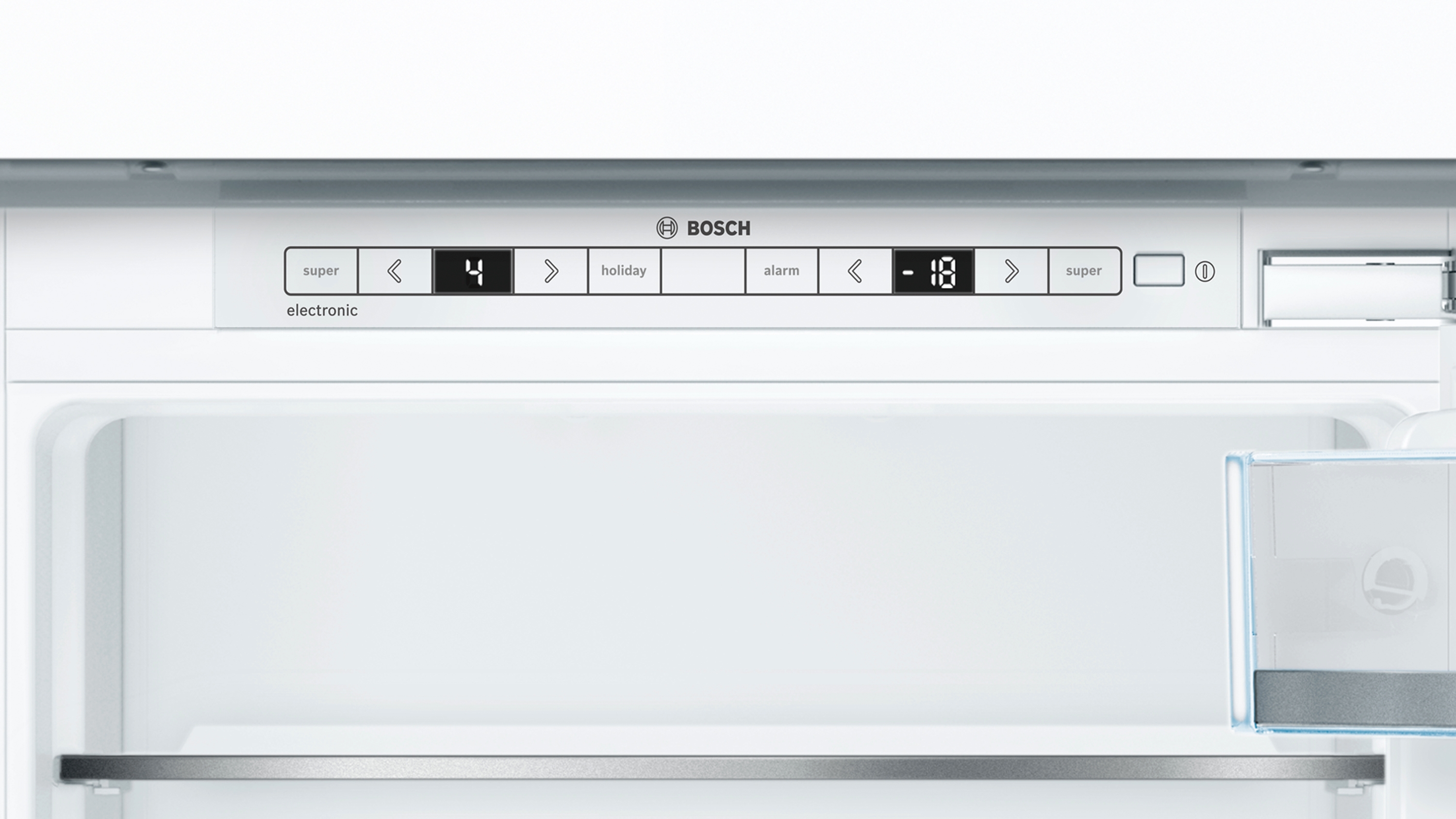 | Bedienelemente: | Superschalter Gefrieren, Superschalter Kühlen, Temperaturanzeige für Kühlen, Warnfunktionen Gefrierteil, Warnsignal Störung Gefrieren, Warnsignal Tür offen |