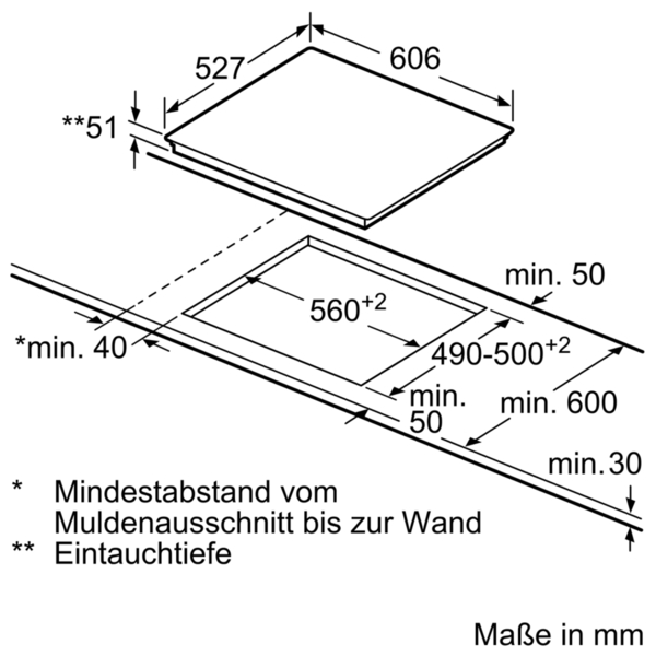 - Erforderliche Nischengröße (HxBxT mm : 51 x 560 x (490 - 500)