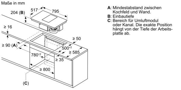 - Einbaumaße: (H/B/T) 204 x 780-780 x 500-500 mm