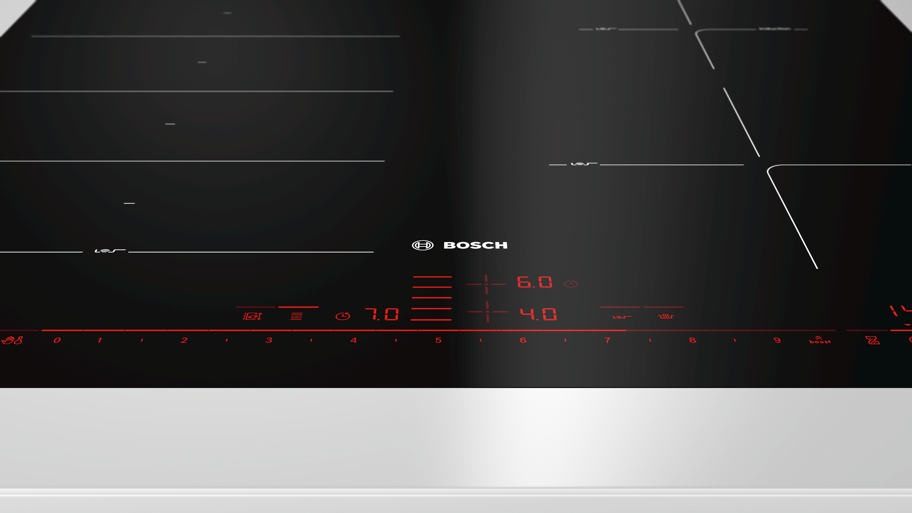 FlexInduktions-Zone: Flexibles Zusammenschalten von Kochzonen zu einer durchgehenden Fläche für kleine Töpfe bis hin zu großem Sonderzubehör