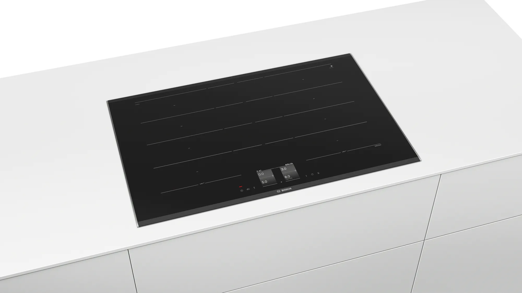 Erweiterte FlexInductions-Zone: noch mehr Flexibilität durch Zusammenschalten der Kochzonen zu einer durchgehenden Fläche, die bei größeren Töpfen noch erweitert werden können.