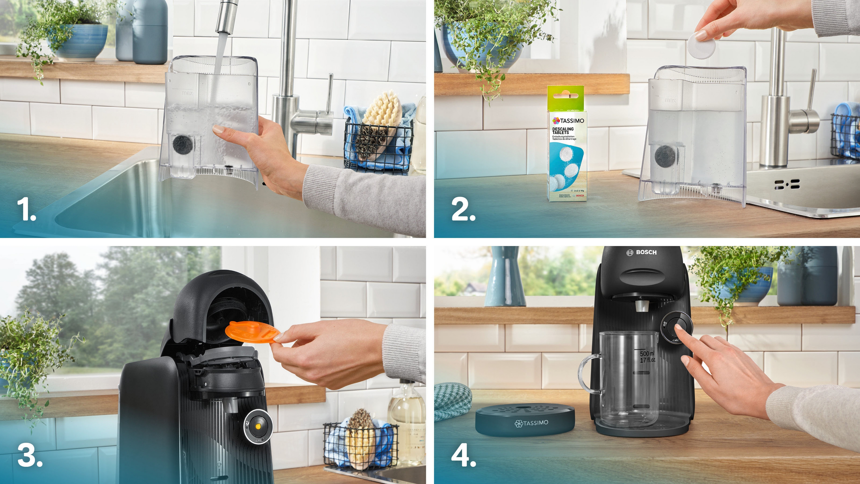 - Original-Entkalkungstabletten (TCZ6004) für die optimale Pflege deiner TASSIMO als Sonderzubehör erhältlich: Mit diesen speziellen Entkalkungstabs kann der automatische Entkalkungsprozess durchgeführt und so die Gerätelebensdauer verlängert werden.