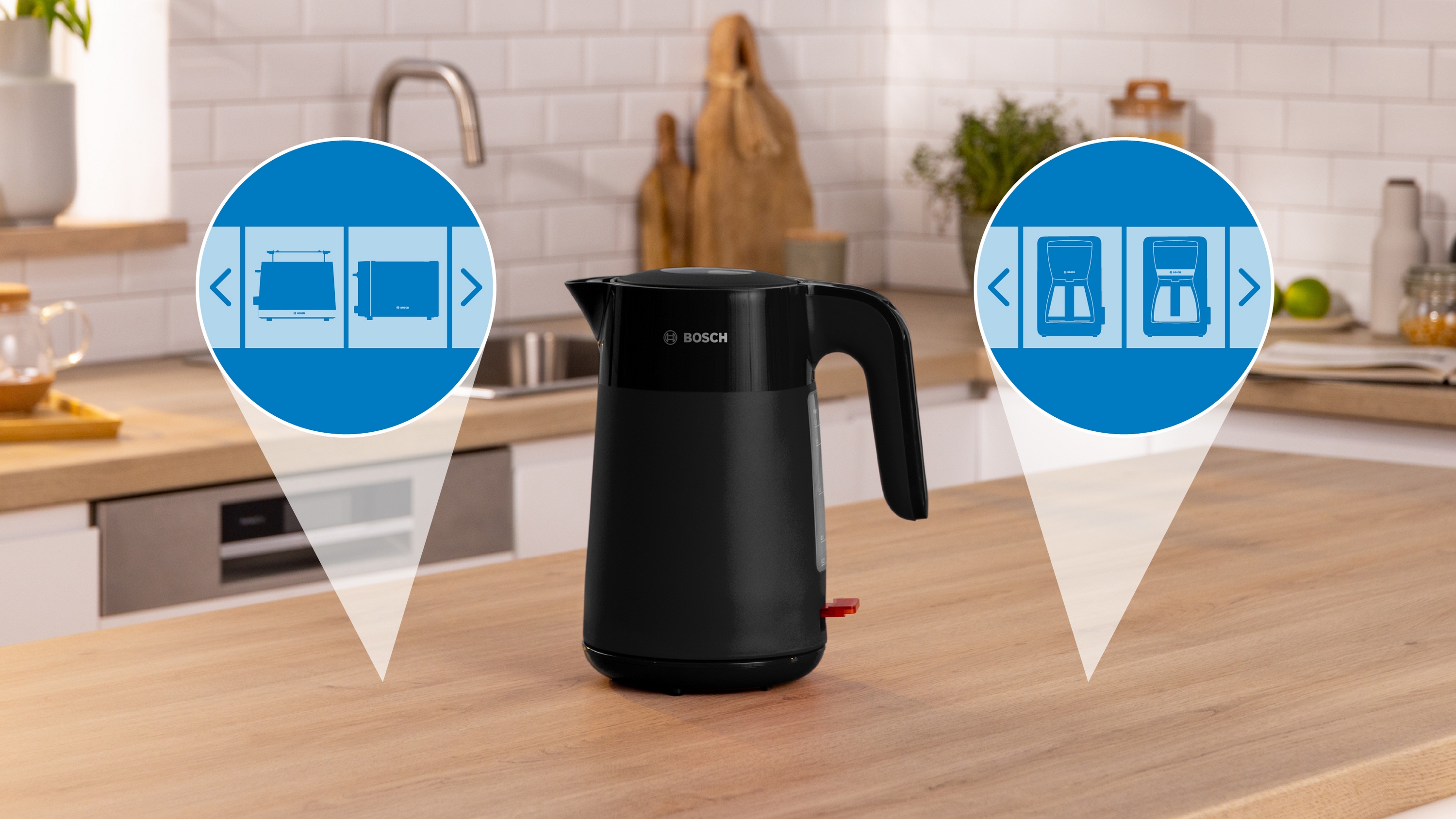 Der Wasserkocher mit komfortabler Handhabung und Tassenanzeige. Das ansprechende Oberflächendesign mit matt-glänzenden Highlights bringt Leben in die Küche.