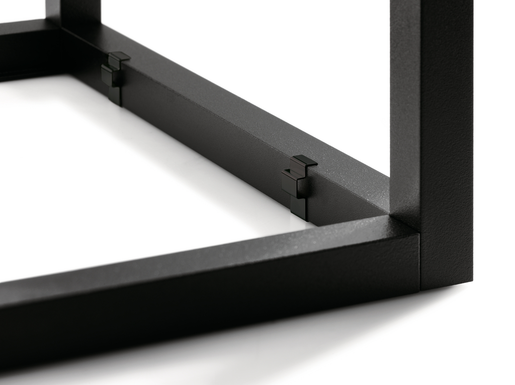 Regalsystem. Klammern sind wendbar für unterschiedliche Höhen unserer Glasplatten (und eigenen Holzböden), 4 bzw. 8 mm, wenn die Böden mit der unteren Strebe bündig sein sollten