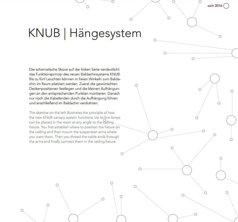 KNUB ist ein Hängesystem für bis zu fünf Pendelleuchten. Es besteht aus einem hochwertigen Baldachin und einzelnen Hängepunkten. Somit bietet DOMUS ab jetzt ein flexibeles Hängesystem im Set an, damit der Kunde mehrere Leuchten stilvoll frei im Raum oder als Gruppe anbringen kann. Eine intelligente Lösung für ein bekanntes Problem, wenn eine Pendelleuchte nicht direkt unter dem Stromauslass hängen soll. Das Knub-System wird im Nachbardorf aus Hartholz gedrechselt. KNUB ist so neutral gestaltet, dass es zu allen Leuchten passt am besten natürlich zu Leuchten von DOMUS LICHT.