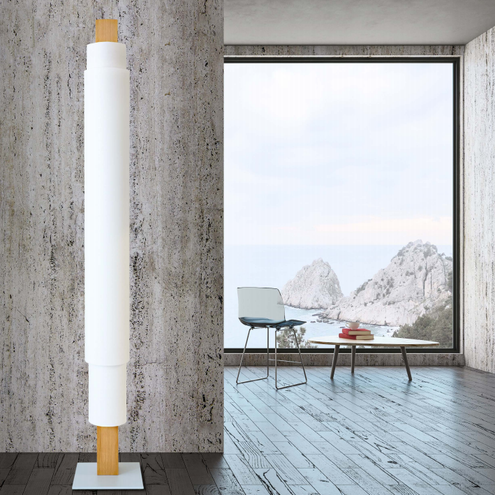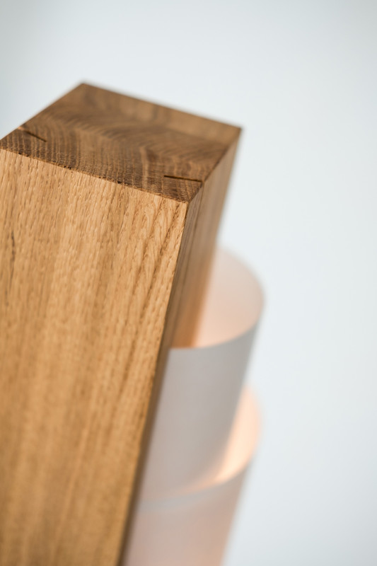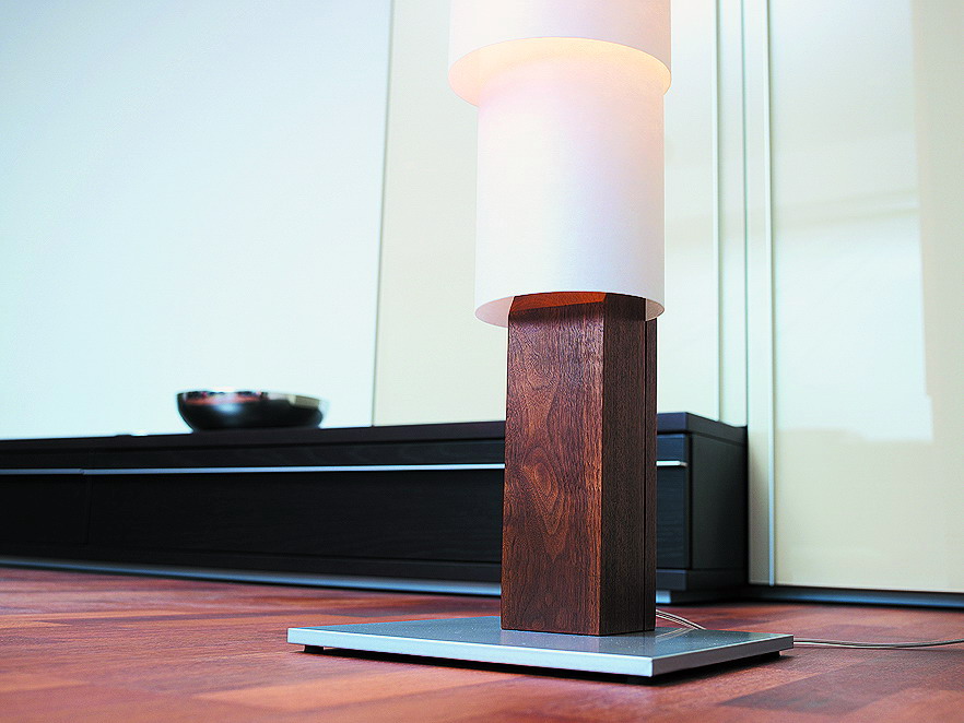 Die Leuchte lebt vom gestalterischen Kontrast des eckig-soliden Holzkorpus und den weich anmutenden runden Lampenschirmen. Der aus massivem Edelholz gearbeitete Leuchtenkörper ruht auf einer quadratischen Stahlplatte.