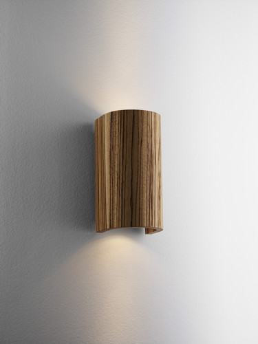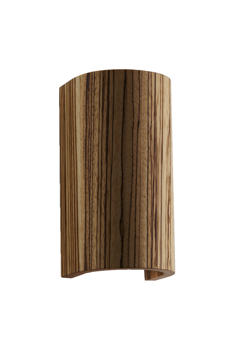 Ein eleganter Formholzbogen aus Edelfurnieren umschließt zwei nach oben und unten gerichtete Reflektorlampen. Die Leuchte ist ideal für die Flur und Treppenhausbeleuchtung.