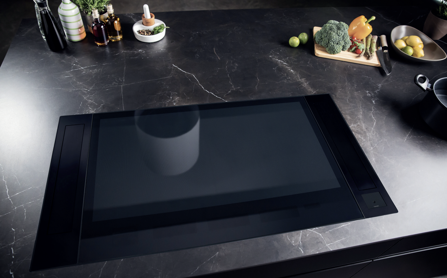 Einfach vernetzt werden Kochfeld und Dunstabzug mithilfe der serienmäßig ausgestatteten homeier AutoRun®-Funktion. Das Touch-Bedienfeld der MISTRAL FLEX ermöglicht ein automatisches Einschalten beim Starten des Kochfeldes.