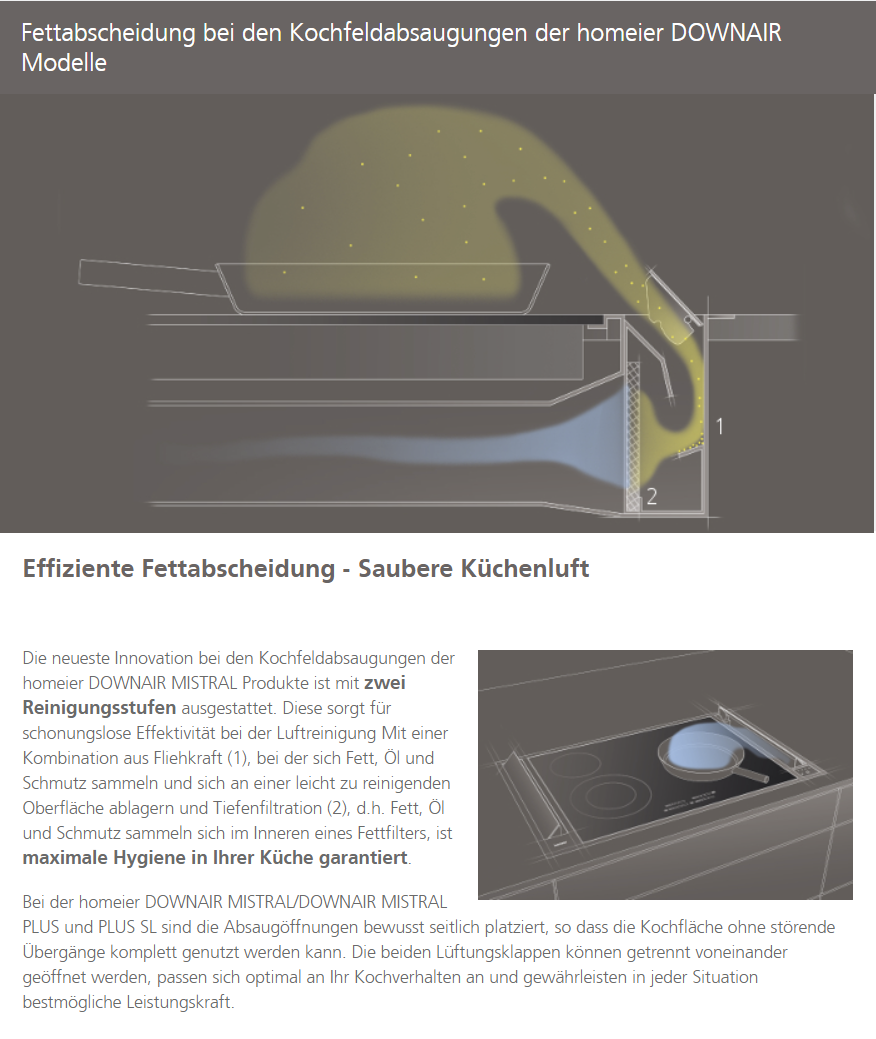 Die homeier Downair MISTRAL FLEX folgt dem ungebrochenen Trend in der Küche, Kochdünste nach unten abzusaugen. Einzigartig an der neuen MISTRAL FLEX von homeier sind die zwei seitlichen Abzüge. Rechts und links neben dem Kochfeld platziert, ermöglichen diese dem anspruchsvollen Küchenliebhaber, ein individuelles, von Hersteller und Marke unabhängiges Kochfeld zu wählen. Diese uneingeschränkte Kombinationsmöglichkeit entspricht dem immer größer werdenden Angebot an vollflächigen Induktionskochfeldern. Und generell dem Wunsch nach mehr Individualität.