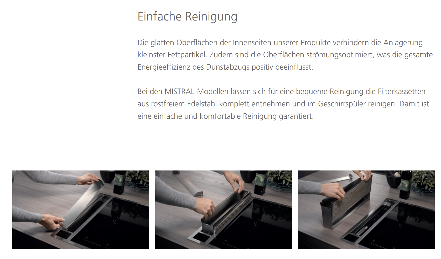 - Einfache Reinigung dank komplett entnehmbaren Filterkassetten - geschirrspülertauglich.
