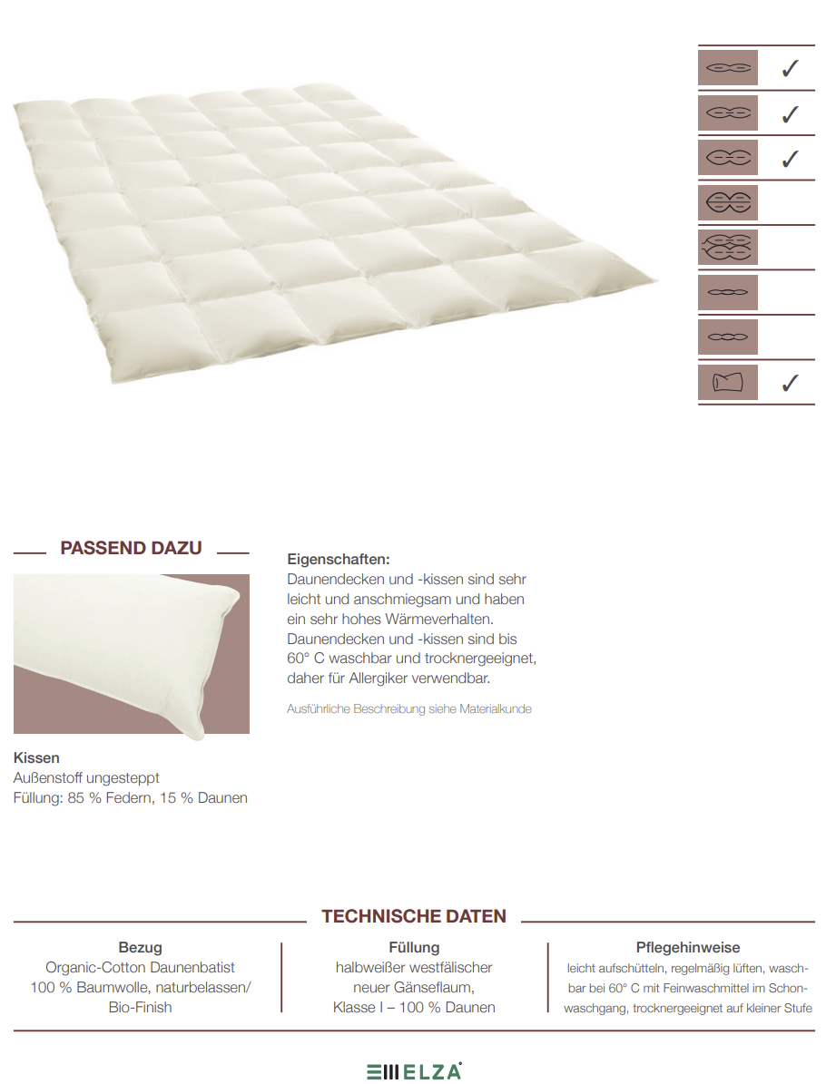 Daunendecken und -Kissen sind sehr leicht und anschmiegsam und haben ein sehr hohes Wärmeverhalten. Sie sind bis 60° C waschbar und trocknergeeignet, daher für Allergiker verwendbar.