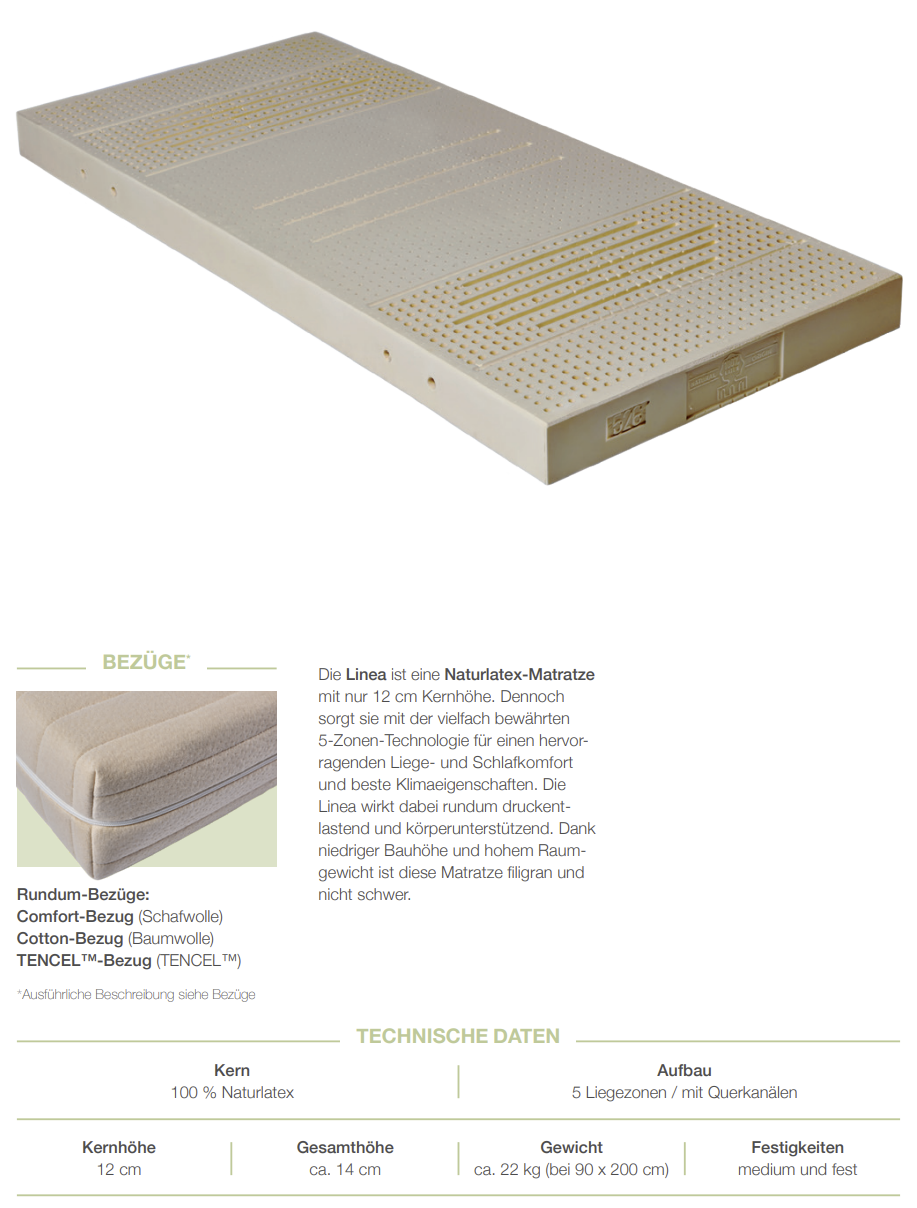 Die Linea ist eine Naturlatex-Matratze mit nur 12 cm Kernhöhe. Dennoch sorgt sie mit der vielfach bewährten 5-Zonen-Technologie für einen hervorragenden Liege- und Schlafkomfort und beste Klimaeigenschaften. Die Linea wirkt dabei rundum druckentlastend und körperunterstützend. Dank niedriger Bauhöhe und hohem Raumgewicht ist diese Matratze filigran und nicht schwer.